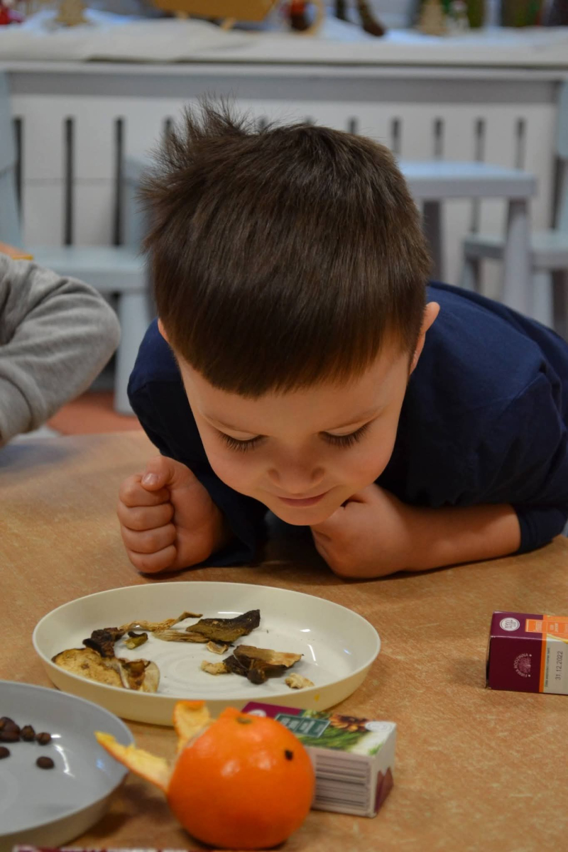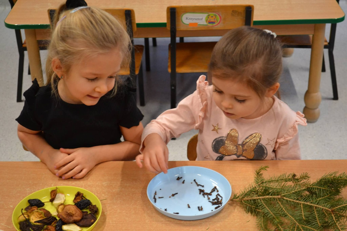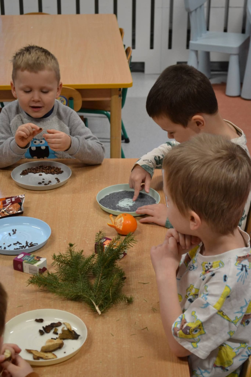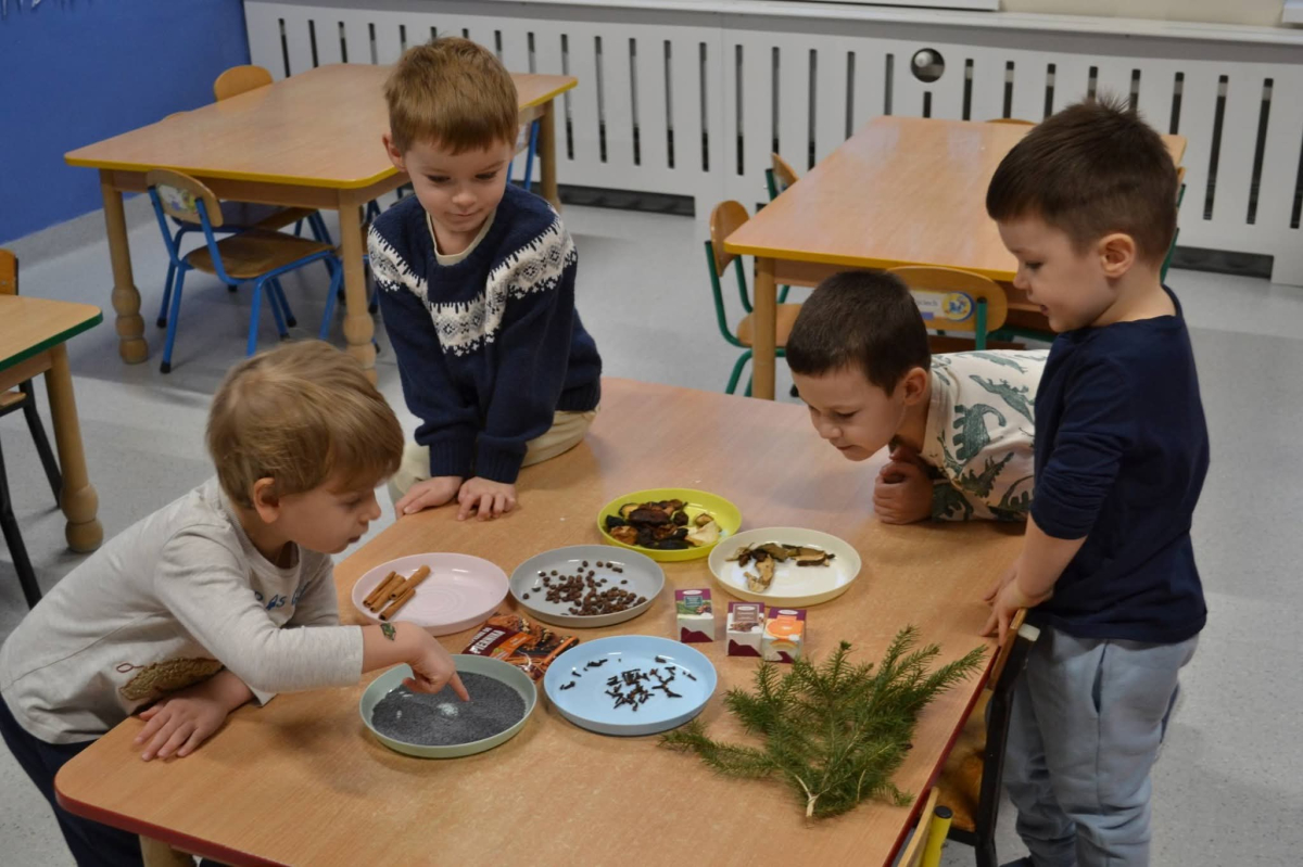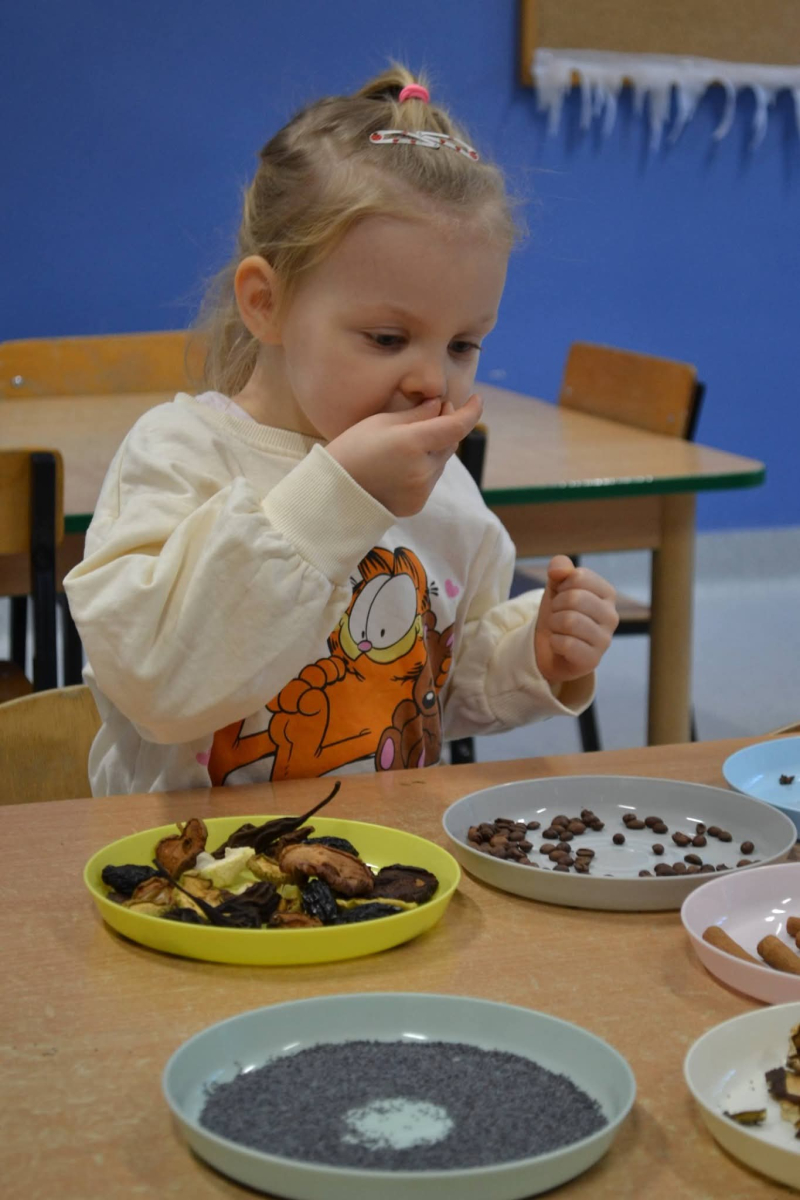 Podczas działań dzieci angażowały zmysł węchu, poznając i rozróżniając charakterystyczne świąteczne aromaty, takie jak: cynamon, goździki, pomarańcze, suszone grzyby i owoce, świerk oraz mak. Zapachy te sprzyjały budowaniu skojarzeń, koncentracji uwagi oraz rozwijaniu wrażliwości sensorycznej.