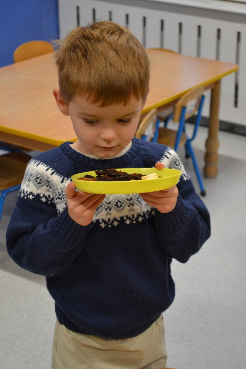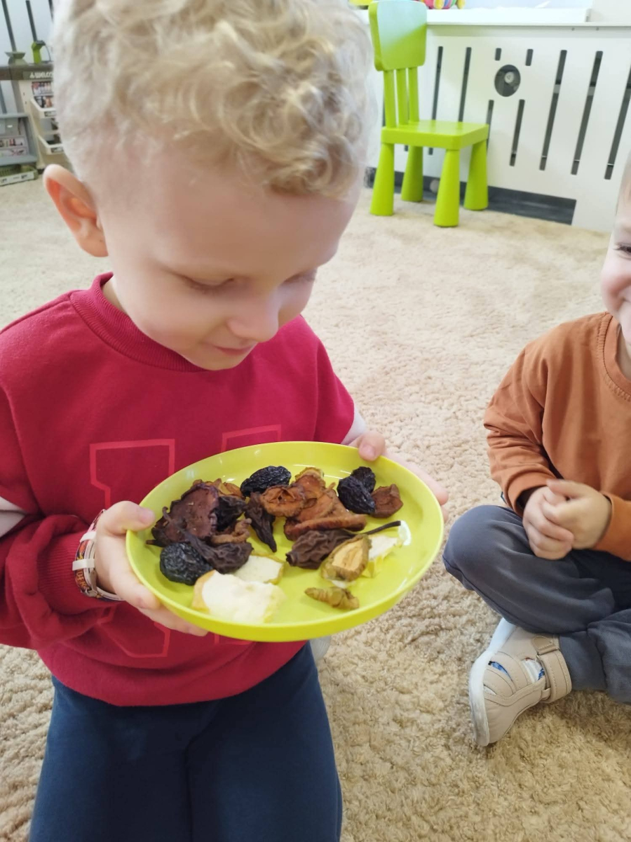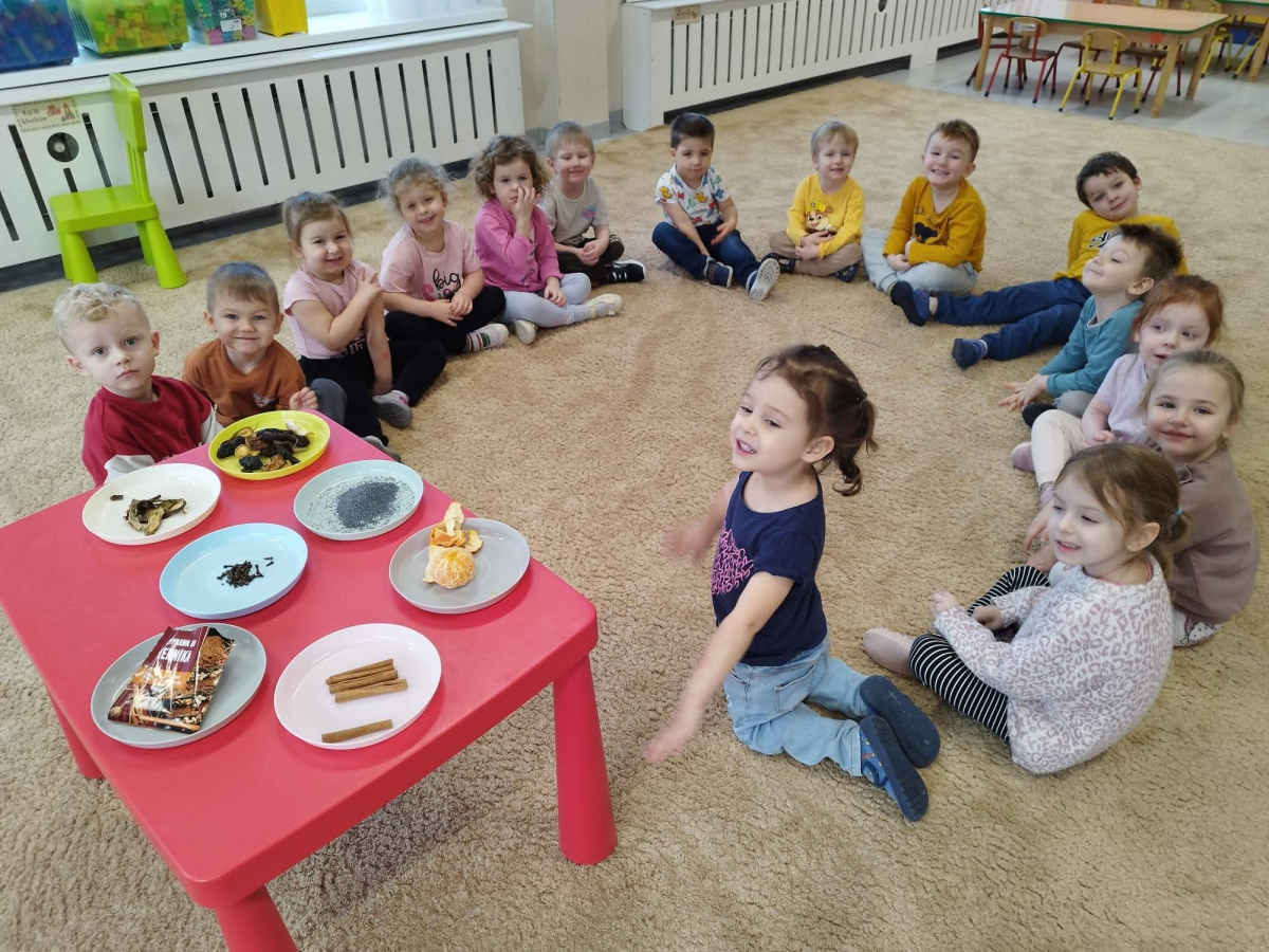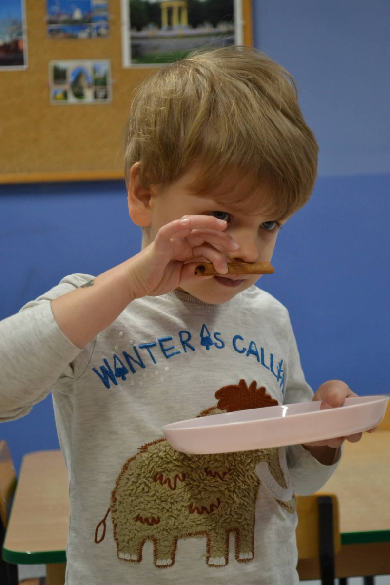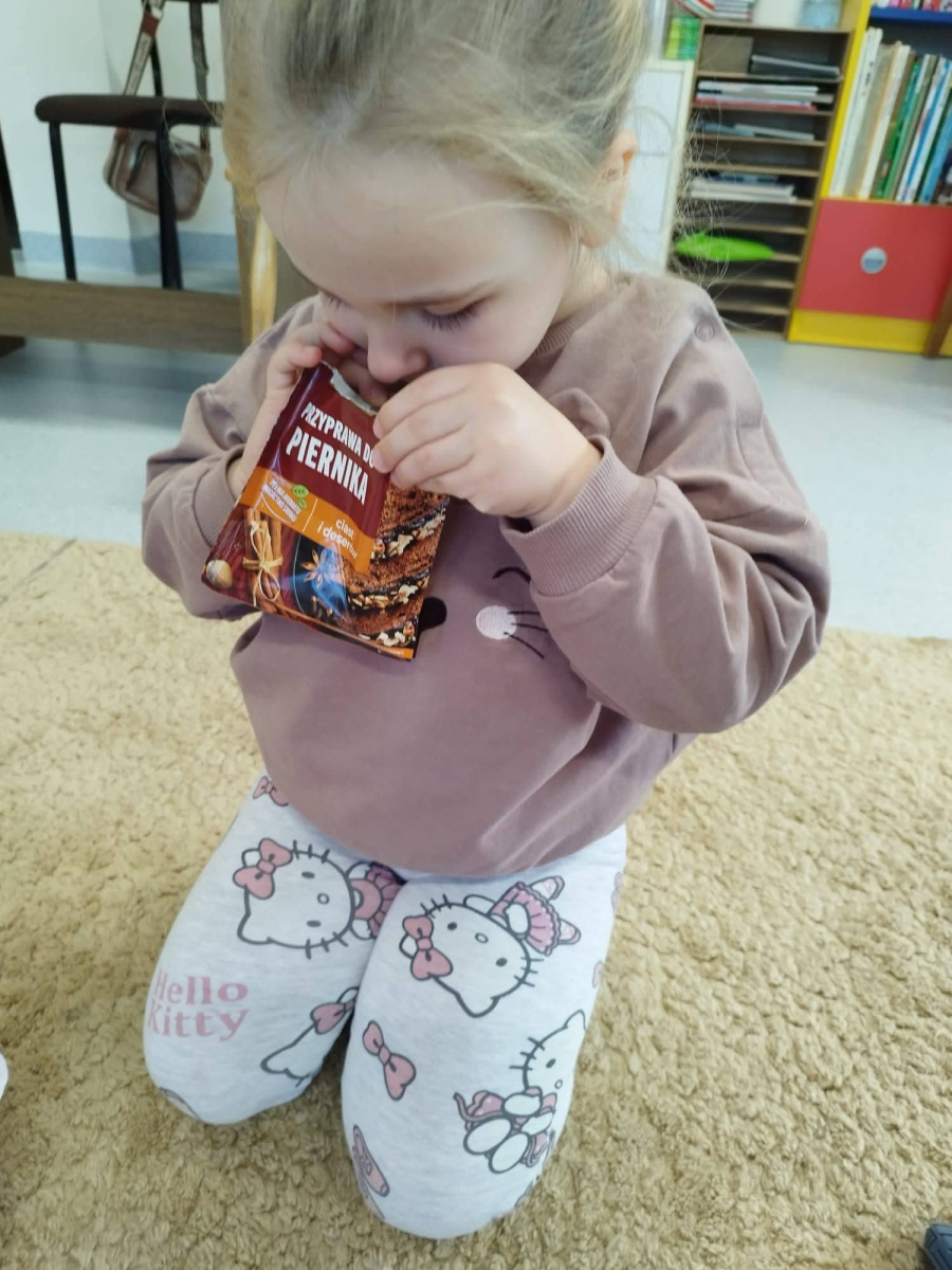 Podczas działań dzieci angażowały zmysł węchu, poznając i rozróżniając charakterystyczne świąteczne aromaty, takie jak: cynamon, goździki, pomarańcze, suszone grzyby i owoce, świerk oraz mak. Zapachy te sprzyjały budowaniu skojarzeń, koncentracji uwagi oraz rozwijaniu wrażliwości sensorycznej.
