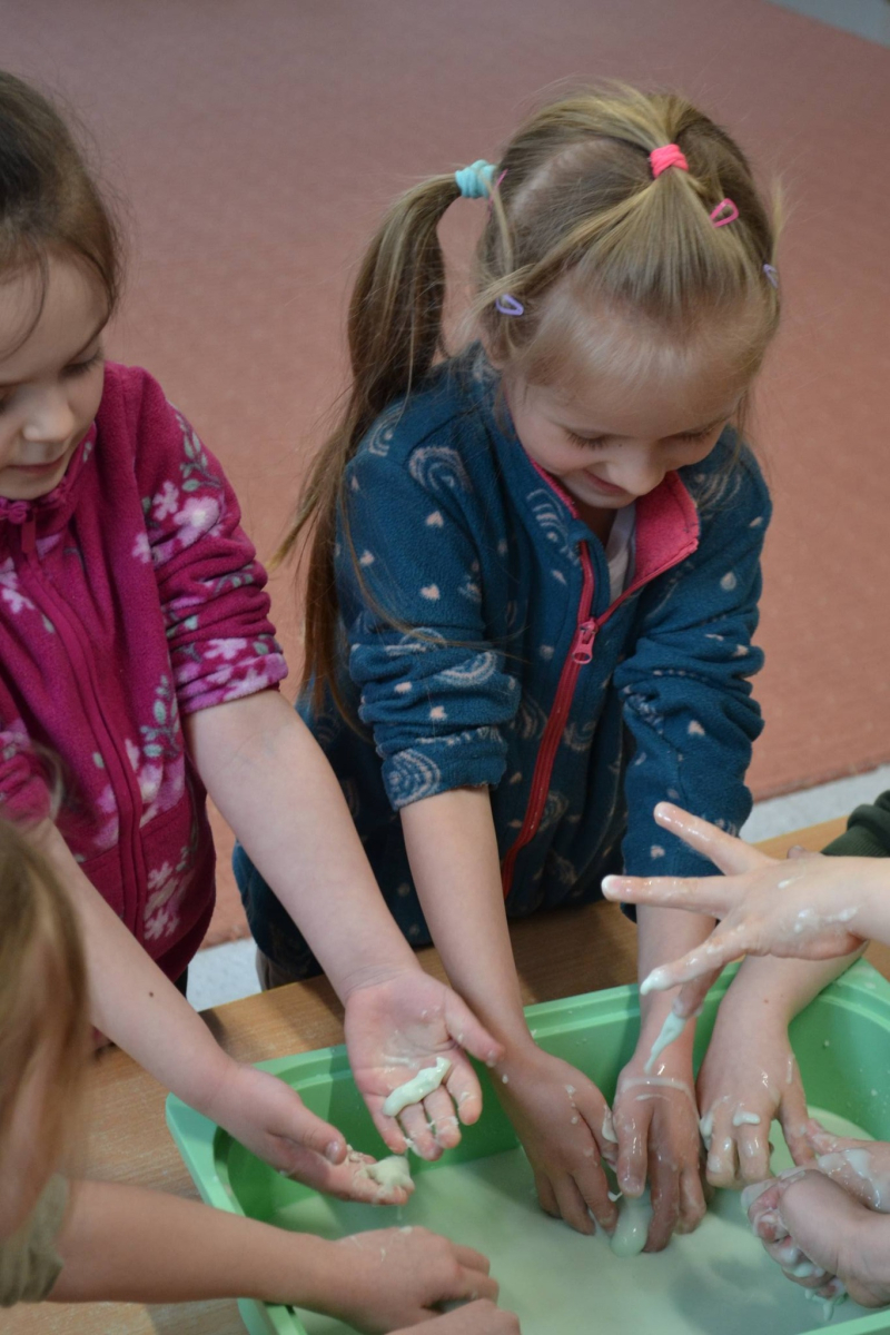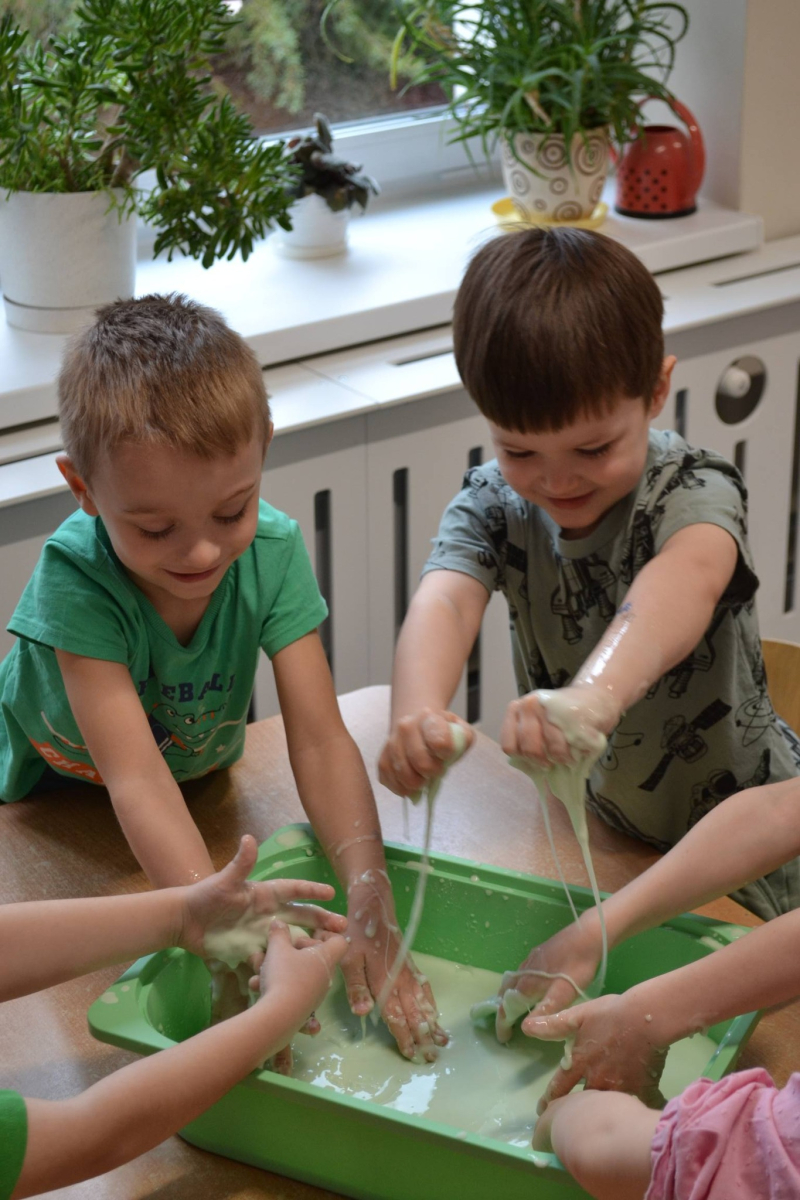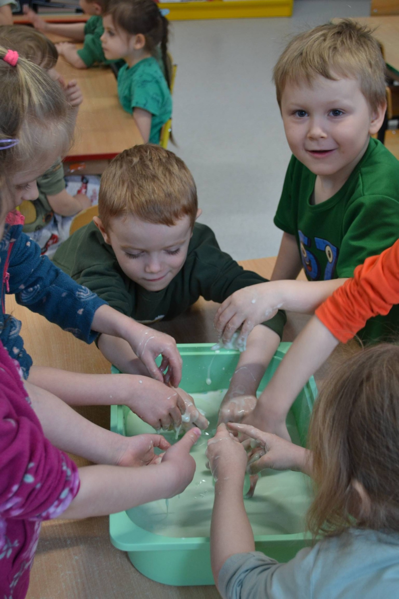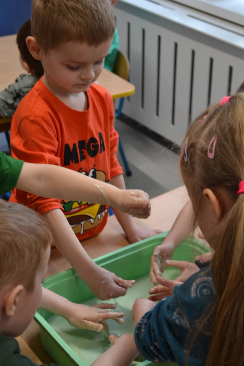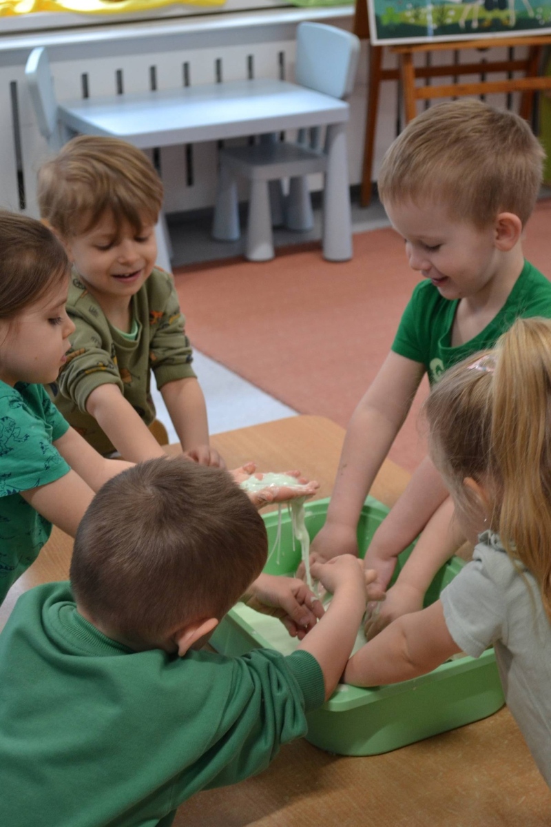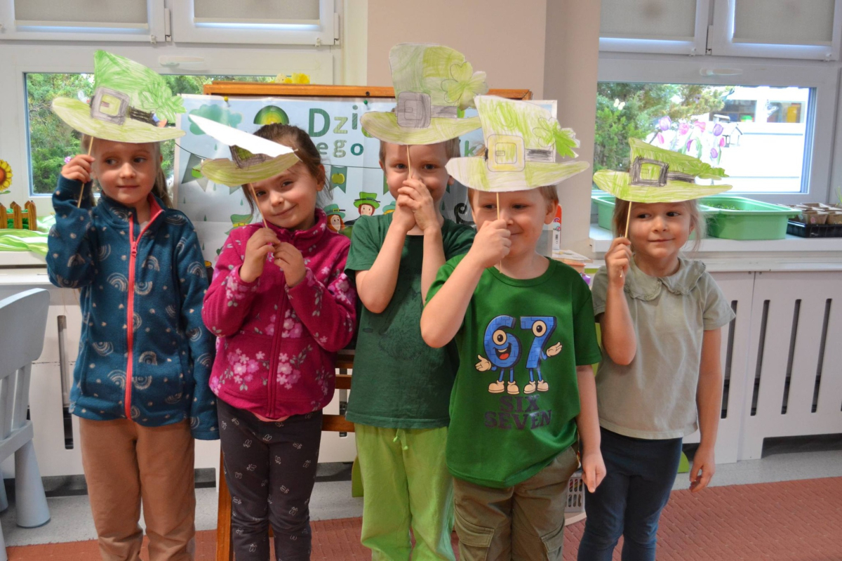 Dzień Świętego Patryka w grupie Muchomorki. W naszej grupie zrobiło się dziś zielono i bardzo magicznie! Dzieci poznały tradycje związane z Dniem Świętego Patryka oraz jego symbole. Wysłuchały także irlandzkiej legendy o sprytnym Leprechaunie i ukrytym garnku złota, która rozbudziła ich wyobraźnię i ciekawość świata. W ramach realizacji innowacji pedagogicznej „Sensoryczne Przygody Malucha” przygotowaliśmy wyjątkową zabawę - zieloną ciecz nienewtonowską. Było to niezwykłe doświadczenie sensoryczne, które angażowało zmysł dotyku, wzroku oraz propriocepcji. Dzieci mogły obserwować, jak ciecz zmienia swoją konsystencję - raz była płynna, a po chwili stawała się twarda pod naciskiem dłoni. To nie tylko świetna zabawa, ale także doskonałe ćwiczenie motoryki małej oraz koordynacji wzrokowo-ruchowej. Nie zabrakło również działań plastycznych - dzieci z ogromnym zaangażowaniem wykonały kolorowe kapelusze Leprechauna. W ostatnim czasie zajmowaliśmy się także zakładaniem hodowli cebuli i rzeżuchy. Dzieci codziennie troskliwie doglądały swoich roślinek, podlewały je i obserwowały ich wzrost. Po tygodniu mogły spróbować, jak smakuje świeża rzeżucha .Była to dla nich cenna lekcja przyrody i zdrowego odżywiania. Dodatkowo samodzielnie ozdobiły doniczki, rozwijając swoją kreatywnoś