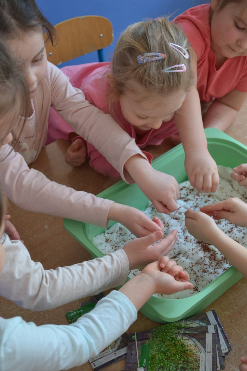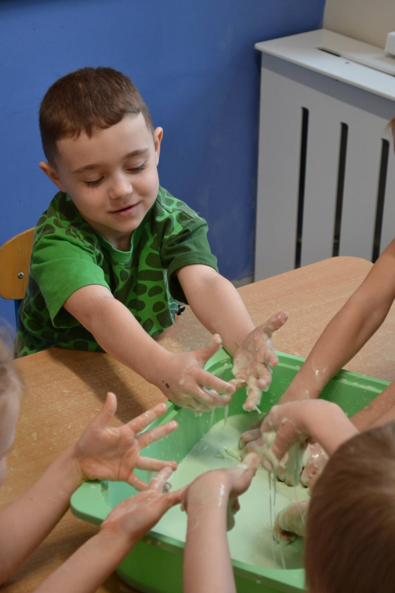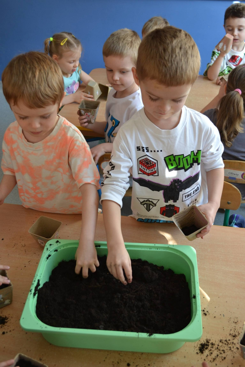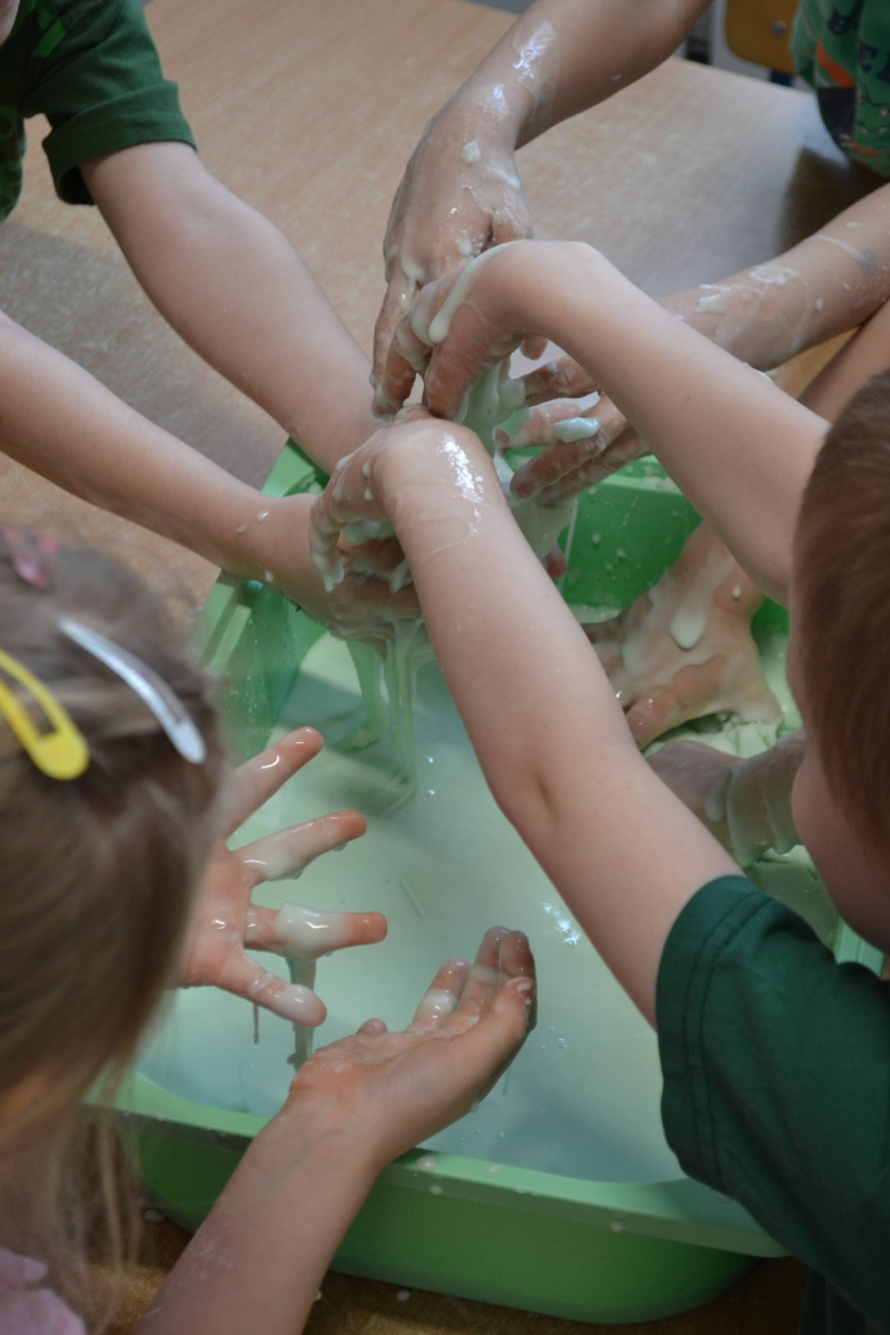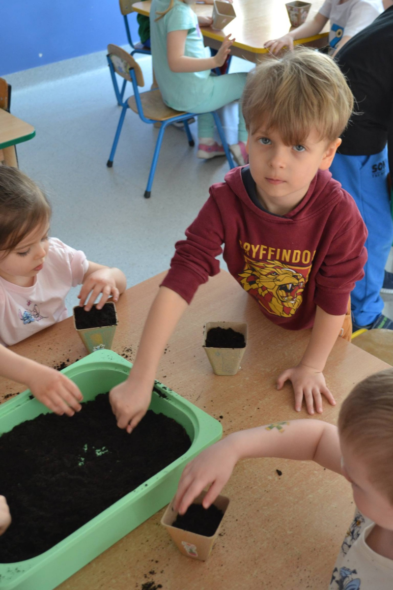 Dzień Świętego Patryka w grupie Muchomorki. W naszej grupie zrobiło się dziś zielono i bardzo magicznie! Dzieci poznały tradycje związane z Dniem Świętego Patryka oraz jego symbole. Wysłuchały także irlandzkiej legendy o sprytnym Leprechaunie i ukrytym garnku złota, która rozbudziła ich wyobraźnię i ciekawość świata. W ramach realizacji innowacji pedagogicznej „Sensoryczne Przygody Malucha” przygotowaliśmy wyjątkową zabawę - zieloną ciecz nienewtonowską. Było to niezwykłe doświadczenie sensoryczne, które angażowało zmysł dotyku, wzroku oraz propriocepcji. Dzieci mogły obserwować, jak ciecz zmienia swoją konsystencję - raz była płynna, a po chwili stawała się twarda pod naciskiem dłoni. To nie tylko świetna zabawa, ale także doskonałe ćwiczenie motoryki małej oraz koordynacji wzrokowo-ruchowej. Nie zabrakło również działań plastycznych - dzieci z ogromnym zaangażowaniem wykonały kolorowe kapelusze Leprechauna. W ostatnim czasie zajmowaliśmy się także zakładaniem hodowli cebuli i rzeżuchy. Dzieci codziennie troskliwie doglądały swoich roślinek, podlewały je i obserwowały ich wzrost. Po tygodniu mogły spróbować, jak smakuje świeża rzeżucha .Była to dla nich cenna lekcja przyrody i zdrowego odżywiania. Dodatkowo samodzielnie ozdobiły doniczki, rozwijając swoją kreatywnoś