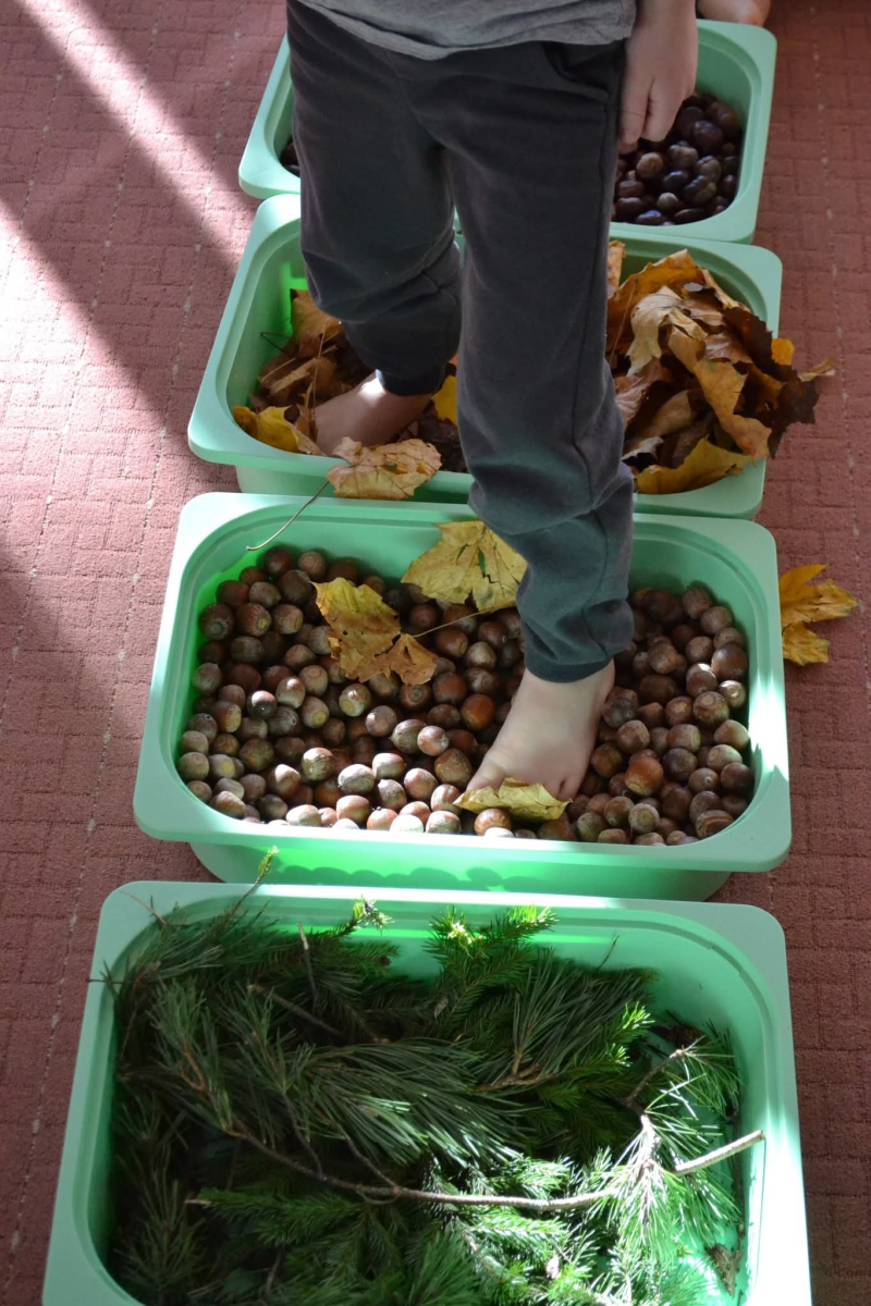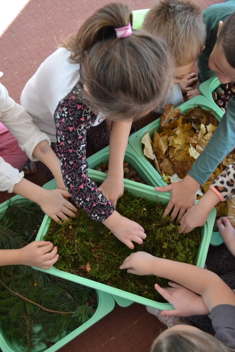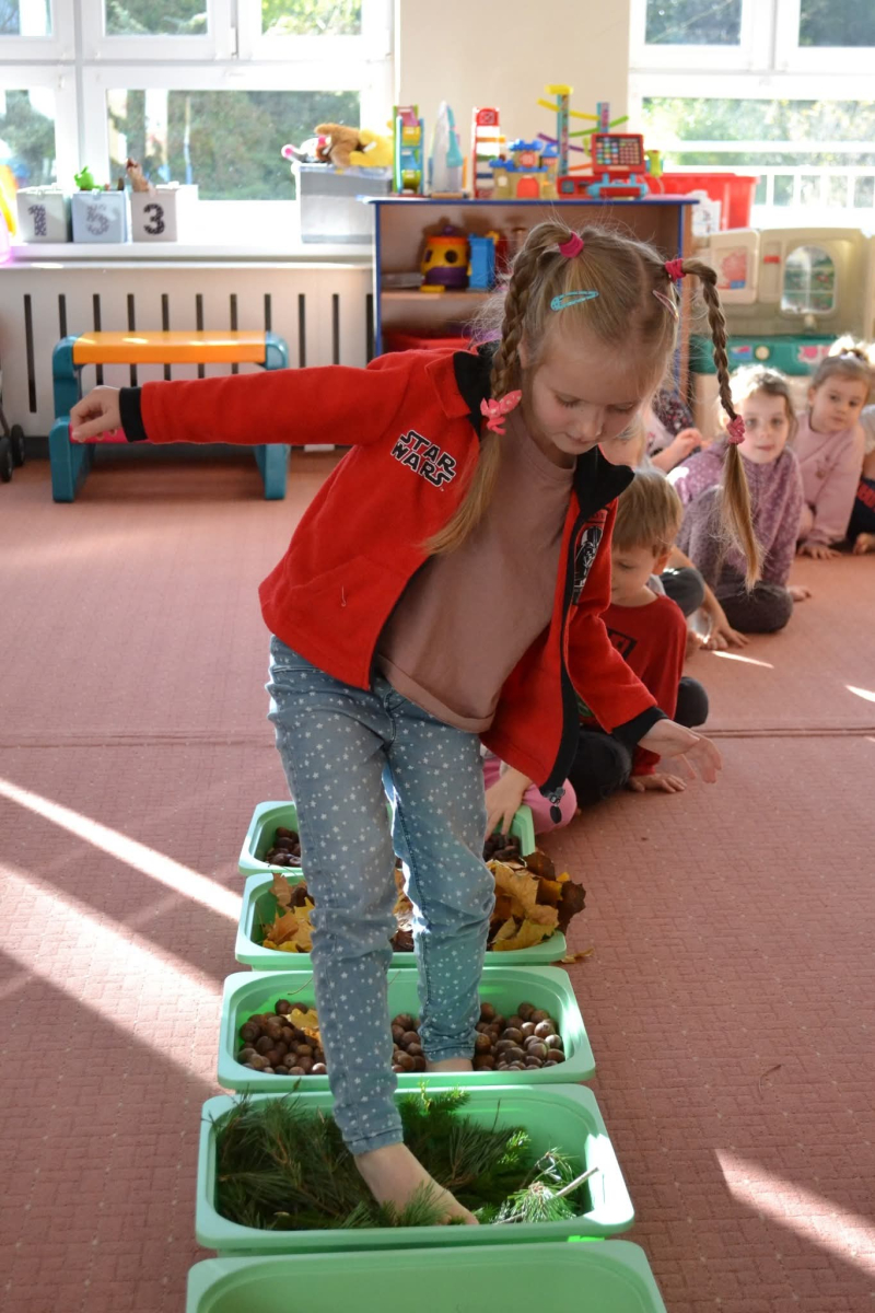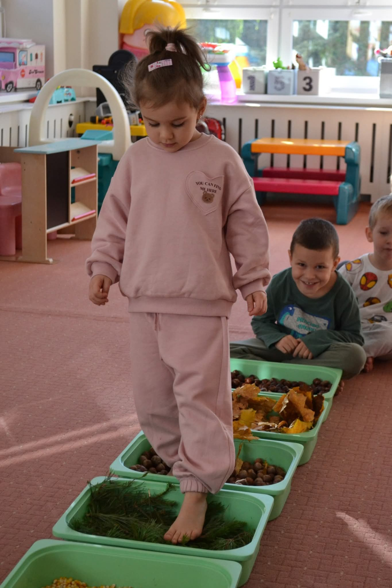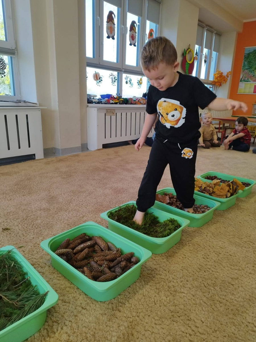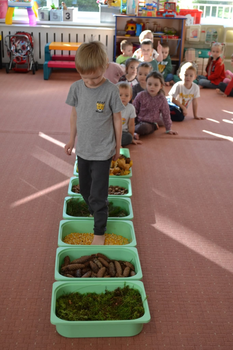 Przedszkolaki wybrały się na spacer po jesiennej ścieżce sensorycznej, wykonanej z naturalnych materiałów: mchu, liści, szyszek, kasztanów i żołędzi - to była prawdziwa uczta dla zmysłów!