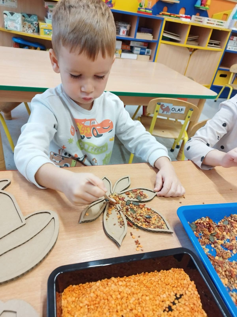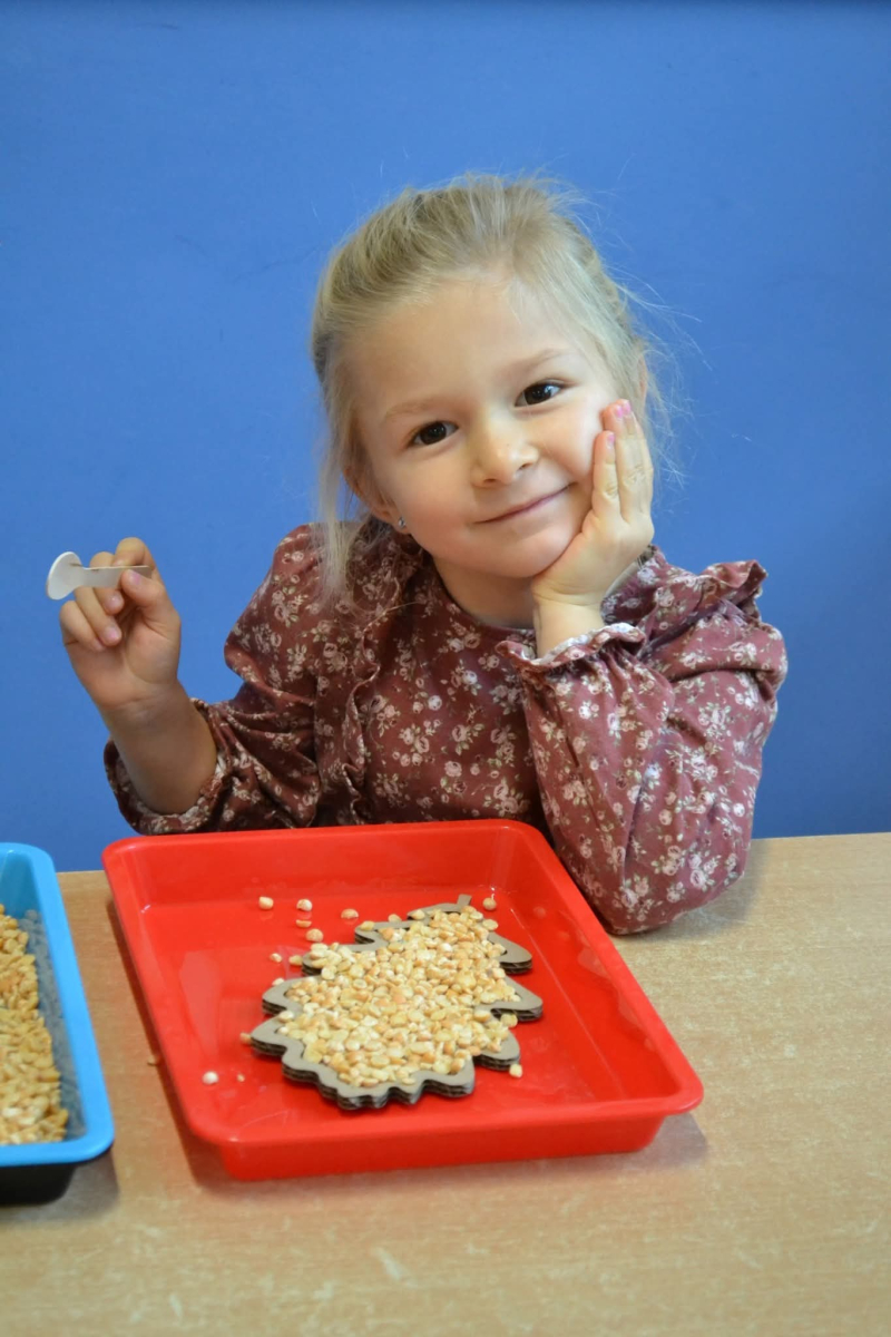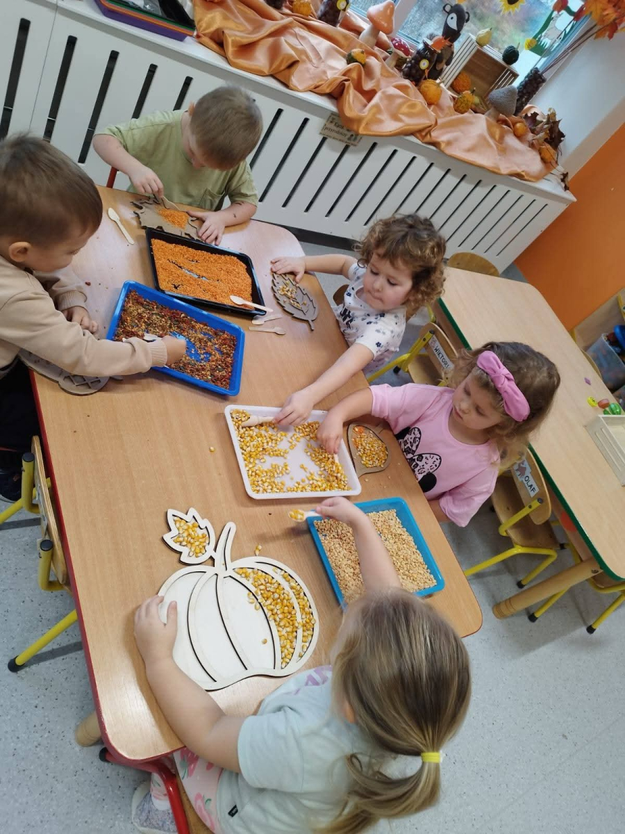 - rozwijały sprawność manualną przy pomocy wysypywanek w jesiennych kształtach, wypełnianych kaszą, kukurydzą, grochem i soczewicą.