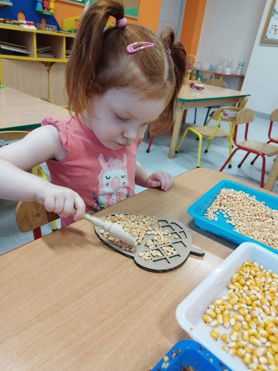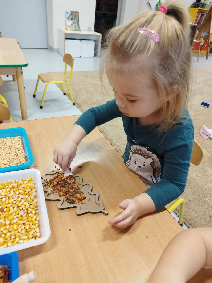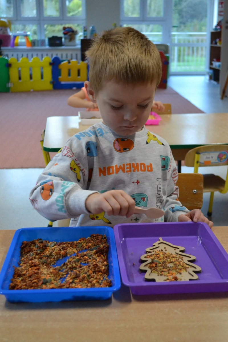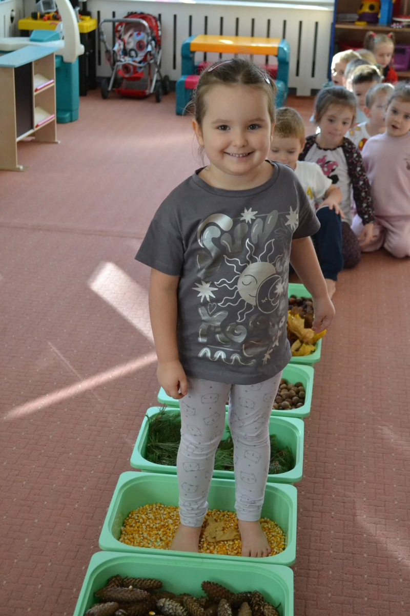 - rozwijały sprawność manualną przy pomocy wysypywanek w jesiennych kształtach, wypełnianych kaszą, kukurydzą, grochem i soczewicą.
