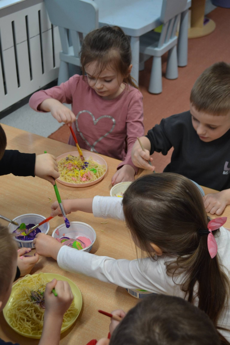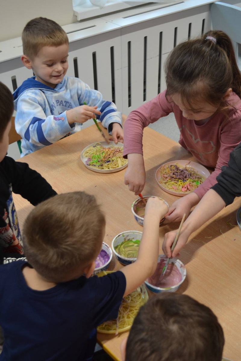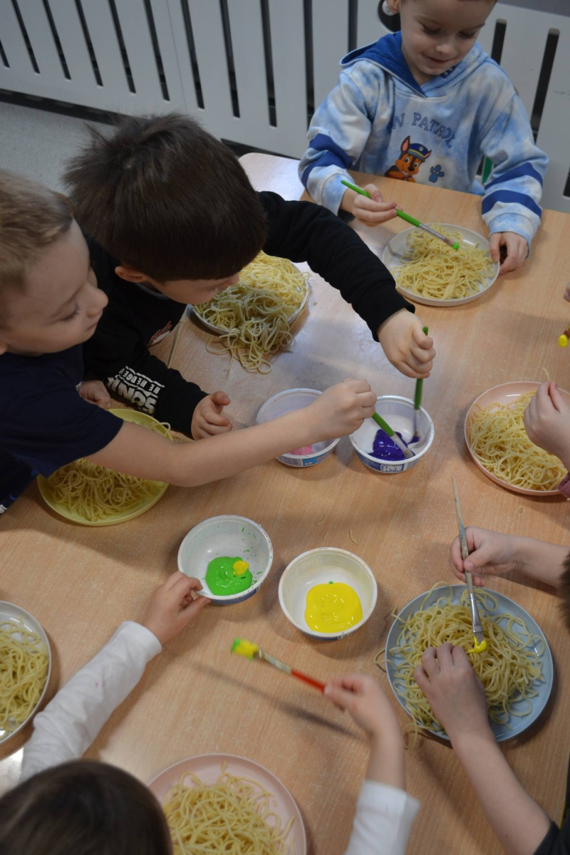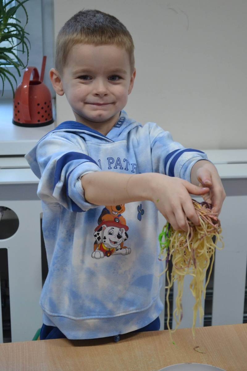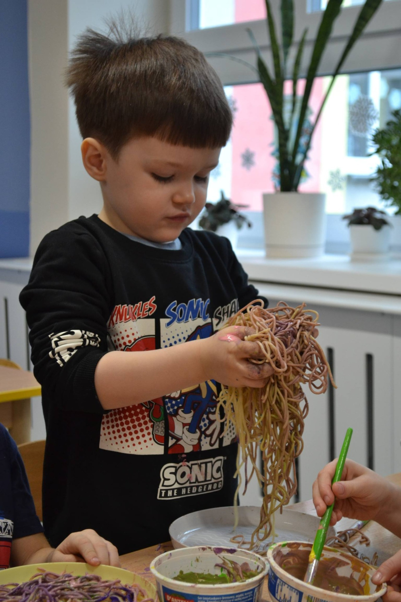 W grupie Muchomorki odbyły się kolejne zajęcia z cyklu „Sensoryczne Przygody Malucha". Zajęcia miały na celu stymulowanie rozwoju zmysłów oraz wspieranie integracji sensorycznej poprzez swobodną, bezpieczną eksplorację różnorodnych faktur i materiałów. Tym razem dzieci doświadczały makaronu spaghetti wielozmysłowo. Dotykały go, badały jego strukturę, słuchały dźwięku przesypywanego makaronu, a także próbowały go smakować. Taka forma aktywności pozwala dziecku budować świadomość sensoryczną oraz rozwijać tolerancję na nowe bodźce. Następnie dzieci malowały makaron farbami, obserwując, jak zmienia się jego wygląd i faktura. Towarzyszyło temu dużo twórczej ekspresji . Kolejnym elementem zajęć było nawlekanie makaronu na patyczki. To doskonała zabawa wspierająca motorykę małą, koordynację wzrokowo ruchową oraz koncentrację. Precyzyjne ruchy dłoni i palców przygotowują dzieci do późniejszej nauki pisania, a skupienie na zadaniu uczy cierpliwości i wytrwałości. Podczas zimowych wysypywanek dzieci tworzyły własne kompozycje, ćwicząc kontrolę ruchu oraz planowanie przestrzenne. Można było zaobserwować, jak bardzo były skoncentrowane na swojej pracy. Atmosfera skupienia i spokojnej aktywności sprzyjała wyciszeniu oraz regulacji emocjonalnej .