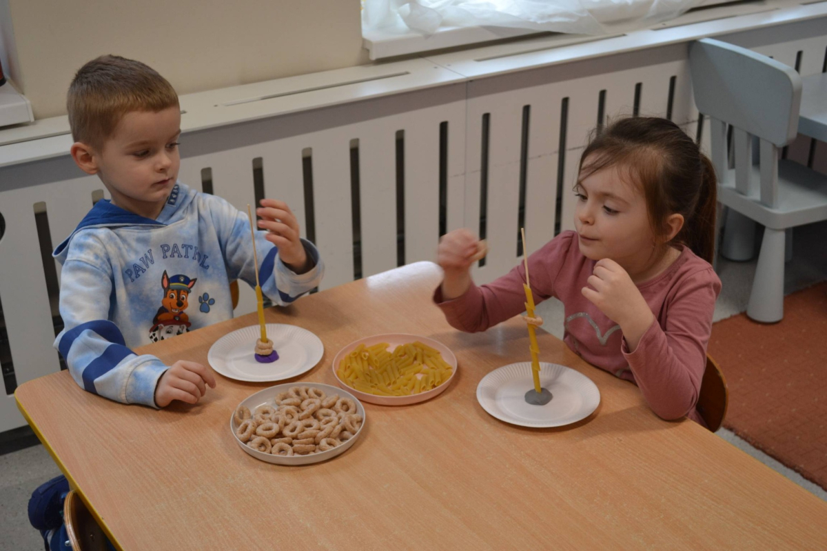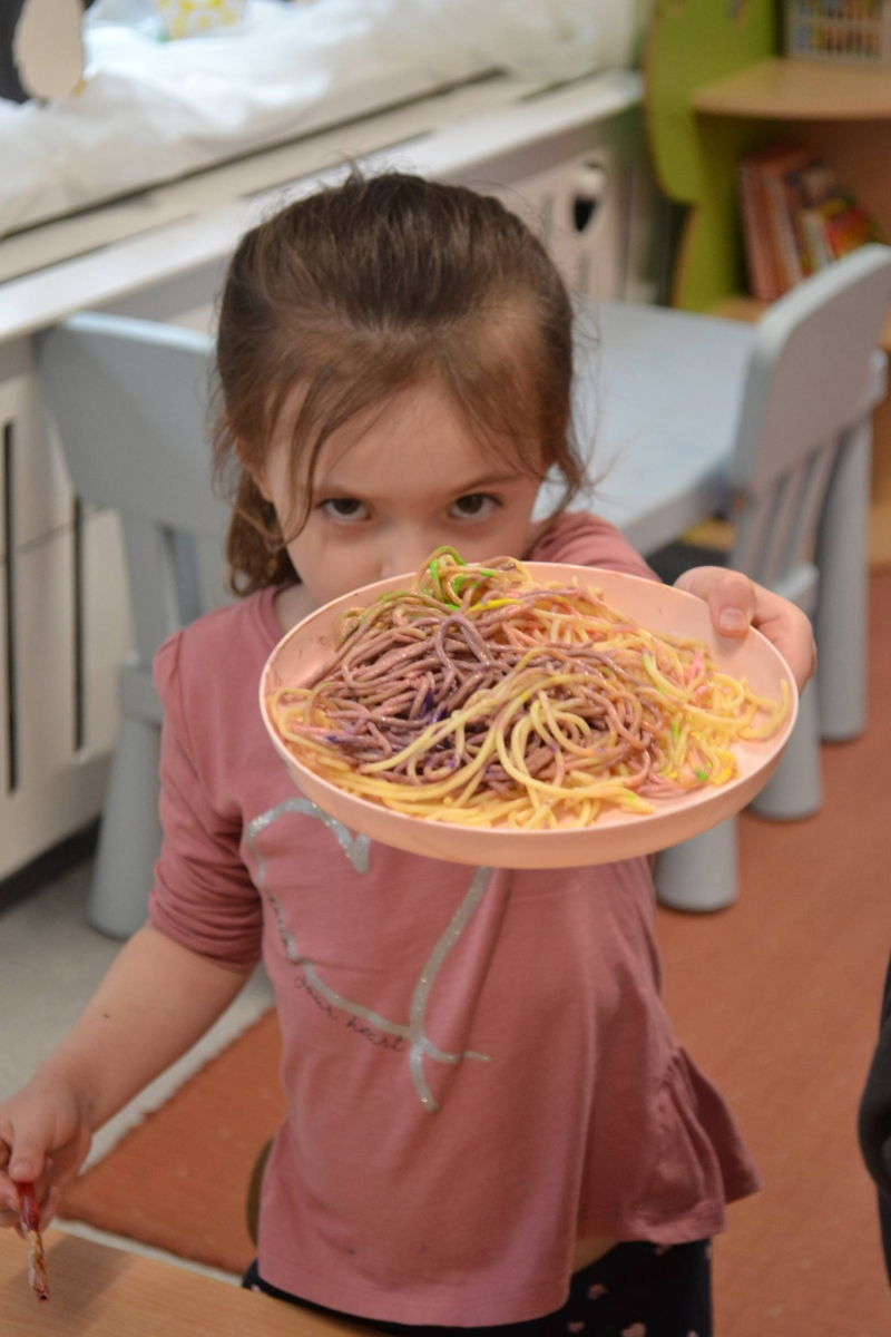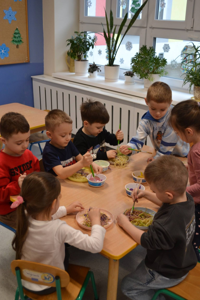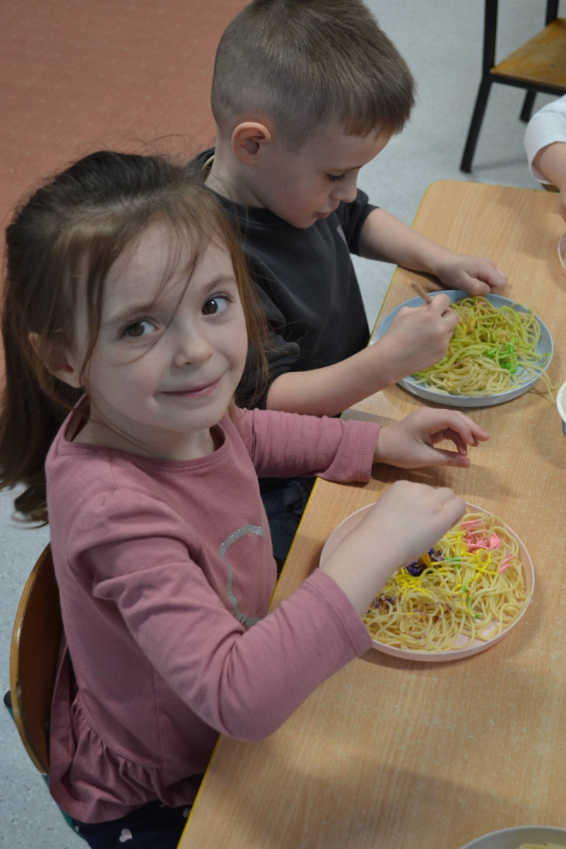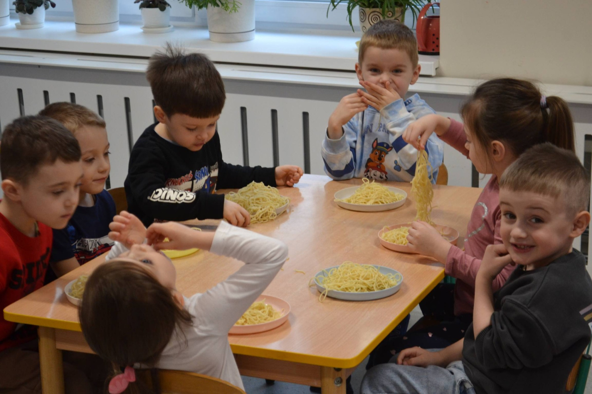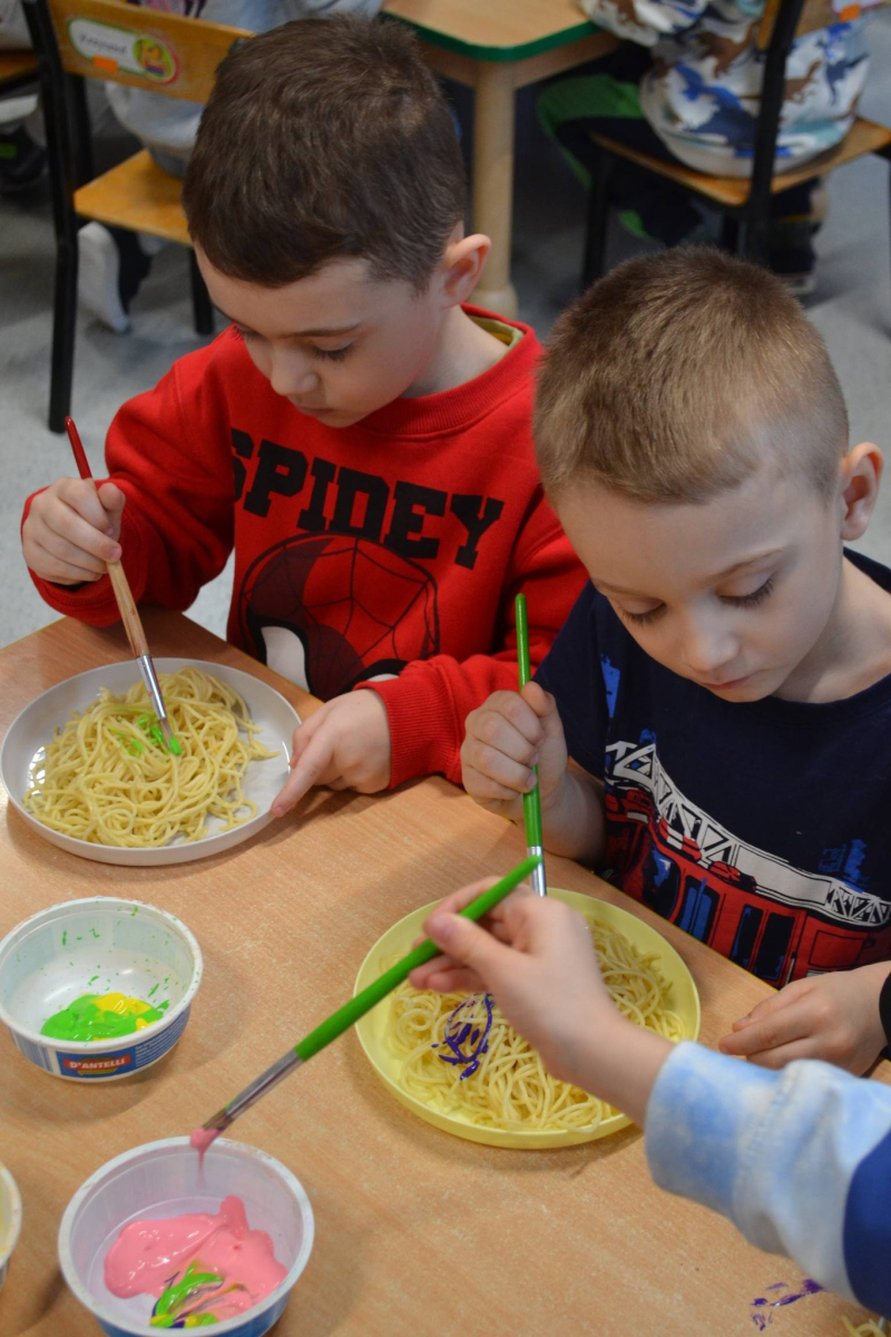 W grupie Muchomorki odbyły się kolejne zajęcia z cyklu „Sensoryczne Przygody Malucha". Zajęcia miały na celu stymulowanie rozwoju zmysłów oraz wspieranie integracji sensorycznej poprzez swobodną, bezpieczną eksplorację różnorodnych faktur i materiałów. Tym razem dzieci doświadczały makaronu spaghetti wielozmysłowo. Dotykały go, badały jego strukturę, słuchały dźwięku przesypywanego makaronu, a także próbowały go smakować. Taka forma aktywności pozwala dziecku budować świadomość sensoryczną oraz rozwijać tolerancję na nowe bodźce. Następnie dzieci malowały makaron farbami, obserwując, jak zmienia się jego wygląd i faktura. Towarzyszyło temu dużo twórczej ekspresji . Kolejnym elementem zajęć było nawlekanie makaronu na patyczki. To doskonała zabawa wspierająca motorykę małą, koordynację wzrokowo ruchową oraz koncentrację. Precyzyjne ruchy dłoni i palców przygotowują dzieci do późniejszej nauki pisania, a skupienie na zadaniu uczy cierpliwości i wytrwałości. Podczas zimowych wysypywanek dzieci tworzyły własne kompozycje, ćwicząc kontrolę ruchu oraz planowanie przestrzenne. Można było zaobserwować, jak bardzo były skoncentrowane na swojej pracy. Atmosfera skupienia i spokojnej aktywności sprzyjała wyciszeniu oraz regulacji emocjonalnej .