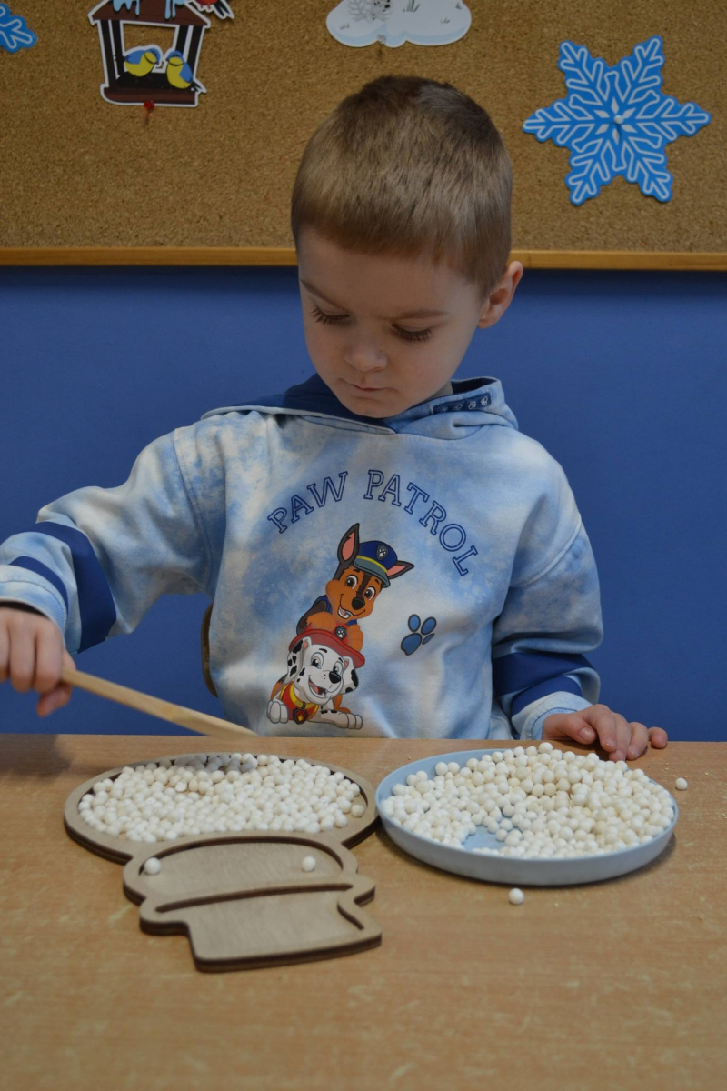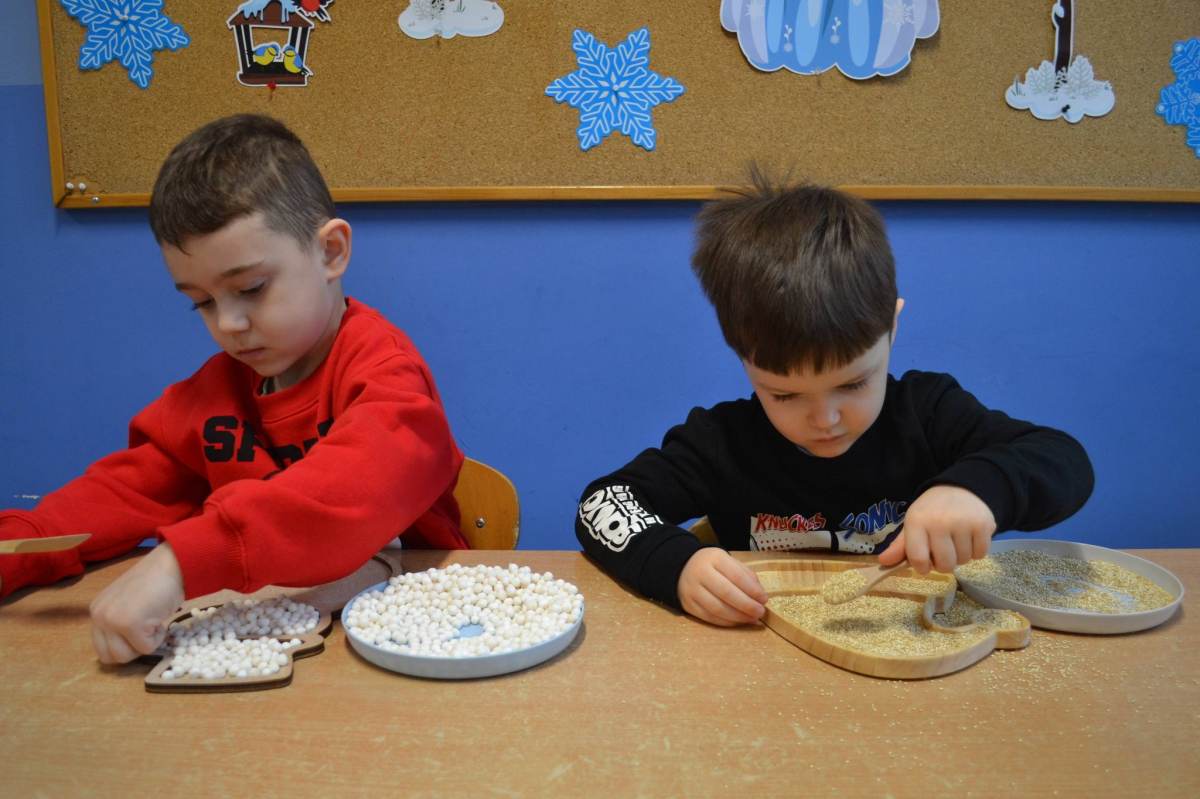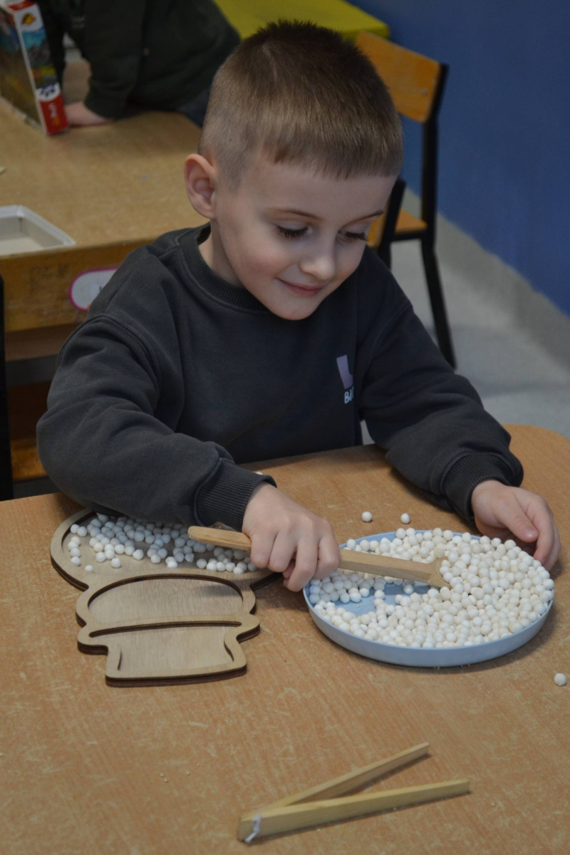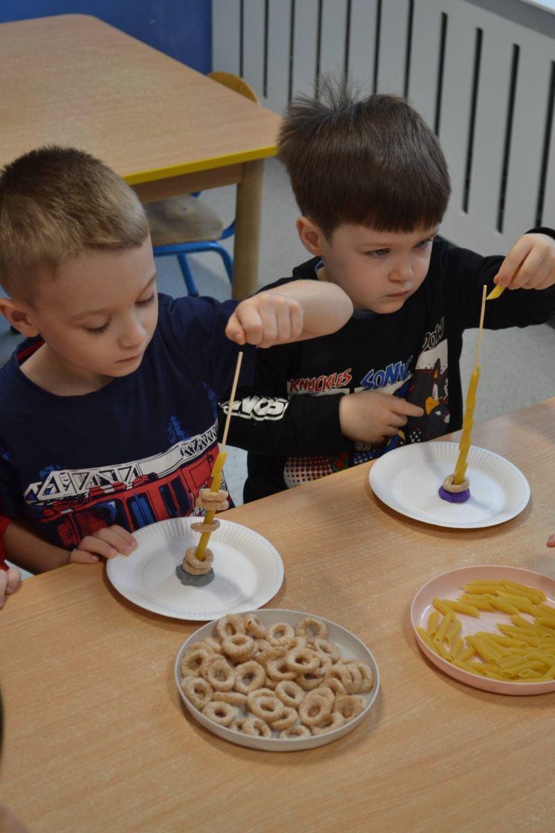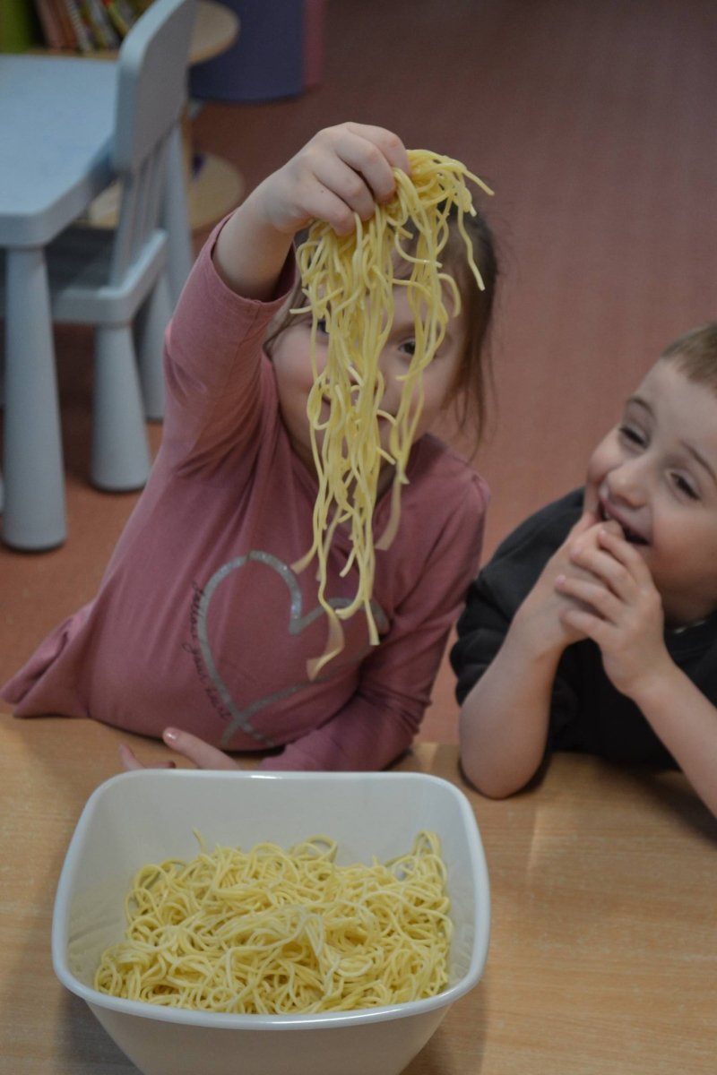 W grupie Muchomorki odbyły się kolejne zajęcia z cyklu „Sensoryczne Przygody Malucha". Zajęcia miały na celu stymulowanie rozwoju zmysłów oraz wspieranie integracji sensorycznej poprzez swobodną, bezpieczną eksplorację różnorodnych faktur i materiałów. Tym razem dzieci doświadczały makaronu spaghetti wielozmysłowo. Dotykały go, badały jego strukturę, słuchały dźwięku przesypywanego makaronu, a także próbowały go smakować. Taka forma aktywności pozwala dziecku budować świadomość sensoryczną oraz rozwijać tolerancję na nowe bodźce. Następnie dzieci malowały makaron farbami, obserwując, jak zmienia się jego wygląd i faktura. Towarzyszyło temu dużo twórczej ekspresji . Kolejnym elementem zajęć było nawlekanie makaronu na patyczki. To doskonała zabawa wspierająca motorykę małą, koordynację wzrokowo ruchową oraz koncentrację. Precyzyjne ruchy dłoni i palców przygotowują dzieci do późniejszej nauki pisania, a skupienie na zadaniu uczy cierpliwości i wytrwałości. Podczas zimowych wysypywanek dzieci tworzyły własne kompozycje, ćwicząc kontrolę ruchu oraz planowanie przestrzenne. Można było zaobserwować, jak bardzo były skoncentrowane na swojej pracy. Atmosfera skupienia i spokojnej aktywności sprzyjała wyciszeniu oraz regulacji emocjonalnej .