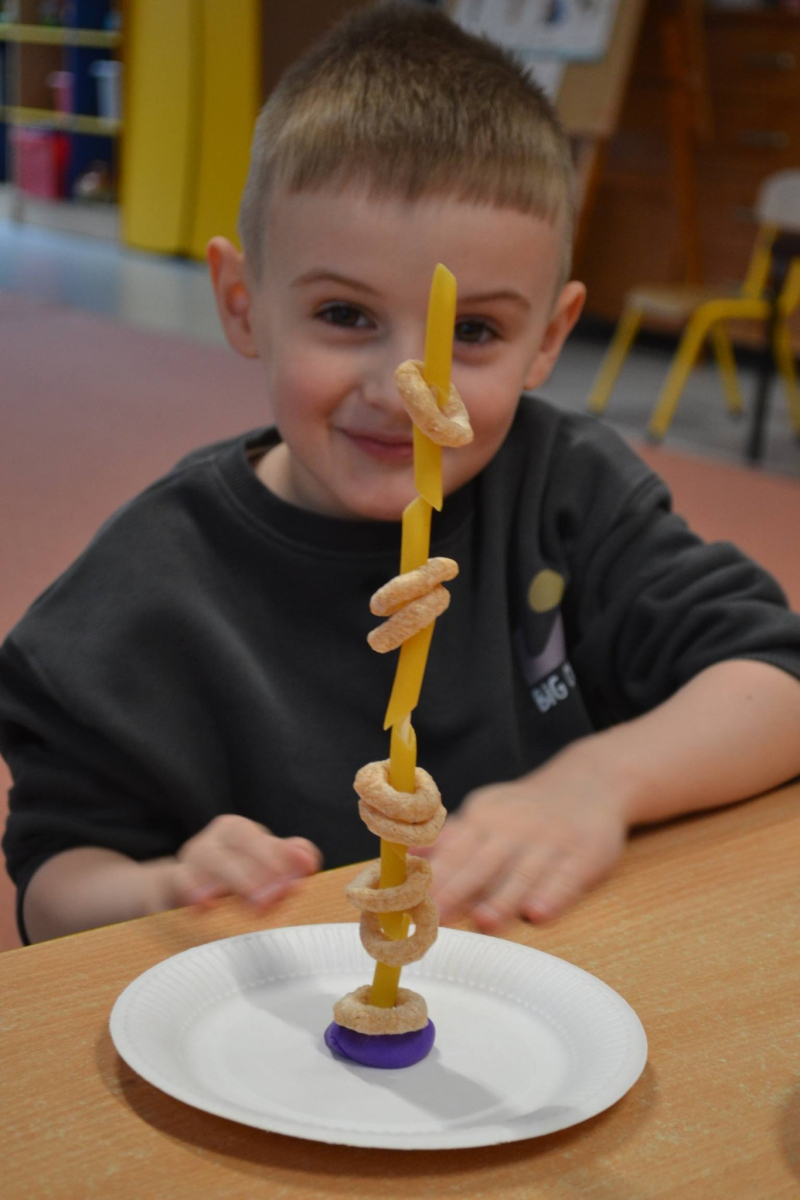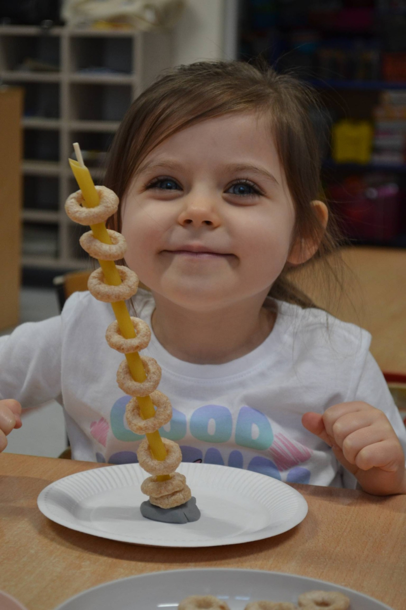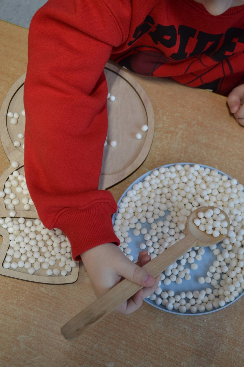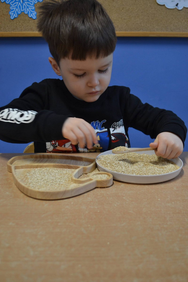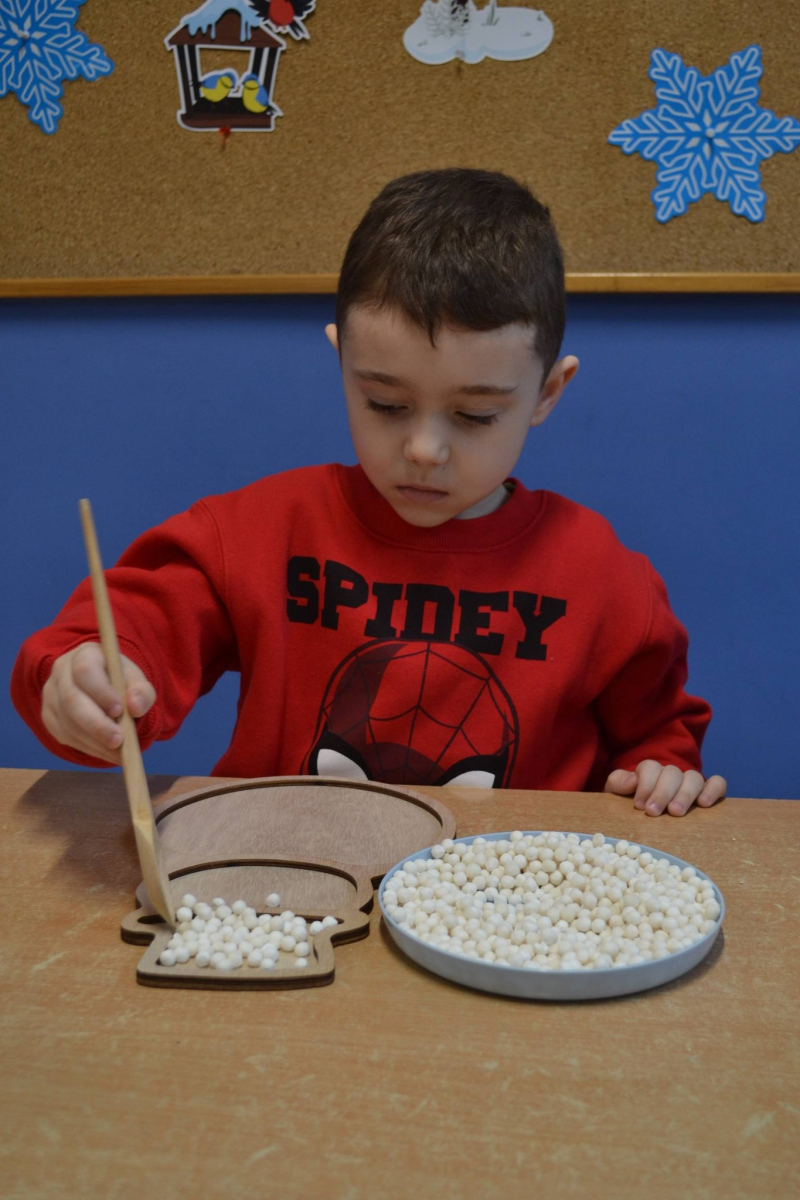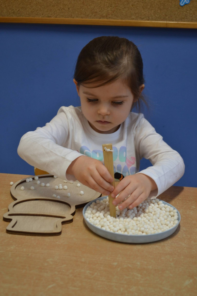W grupie Muchomorki odbyły się kolejne zajęcia z cyklu „Sensoryczne Przygody Malucha". Zajęcia miały na celu stymulowanie rozwoju zmysłów oraz wspieranie integracji sensorycznej poprzez swobodną, bezpieczną eksplorację różnorodnych faktur i materiałów. Tym razem dzieci doświadczały makaronu spaghetti wielozmysłowo. Dotykały go, badały jego strukturę, słuchały dźwięku przesypywanego makaronu, a także próbowały go smakować. Taka forma aktywności pozwala dziecku budować świadomość sensoryczną oraz rozwijać tolerancję na nowe bodźce. Następnie dzieci malowały makaron farbami, obserwując, jak zmienia się jego wygląd i faktura. Towarzyszyło temu dużo twórczej ekspresji . Kolejnym elementem zajęć było nawlekanie makaronu na patyczki. To doskonała zabawa wspierająca motorykę małą, koordynację wzrokowo ruchową oraz koncentrację. Precyzyjne ruchy dłoni i palców przygotowują dzieci do późniejszej nauki pisania, a skupienie na zadaniu uczy cierpliwości i wytrwałości. Podczas zimowych wysypywanek dzieci tworzyły własne kompozycje, ćwicząc kontrolę ruchu oraz planowanie przestrzenne. Można było zaobserwować, jak bardzo były skoncentrowane na swojej pracy. Atmosfera skupienia i spokojnej aktywności sprzyjała wyciszeniu oraz regulacji emocjonalnej .