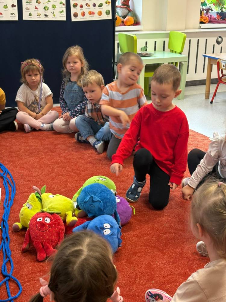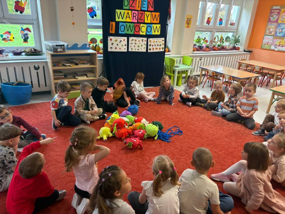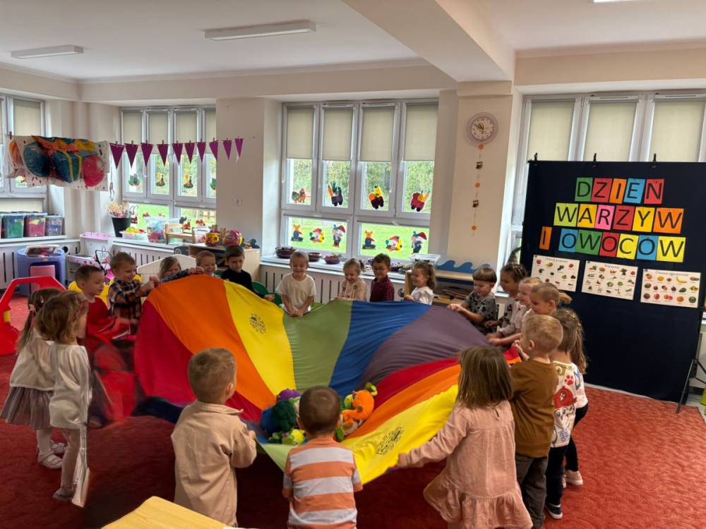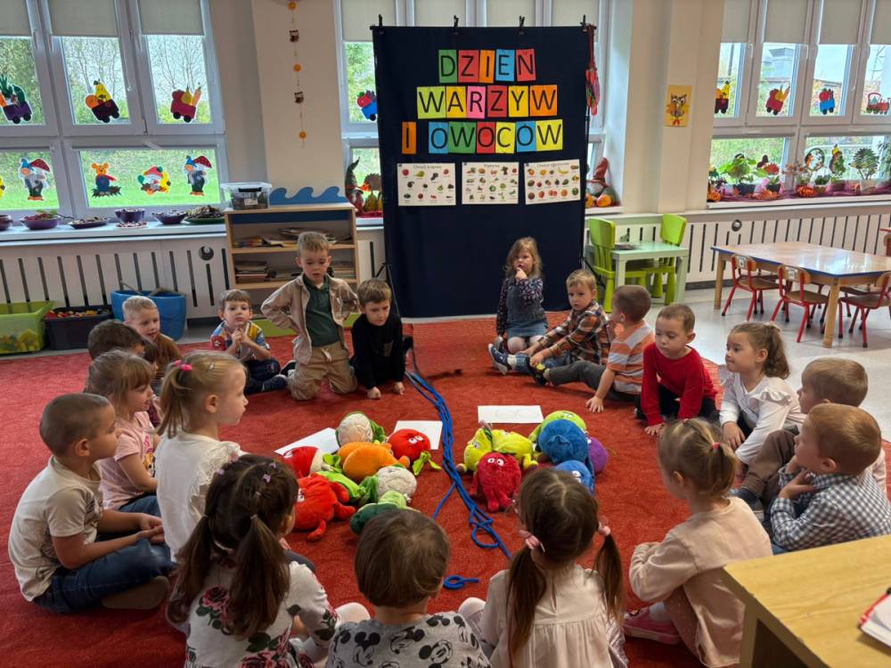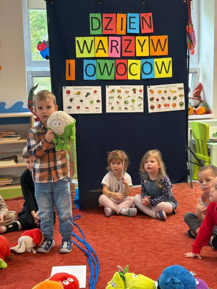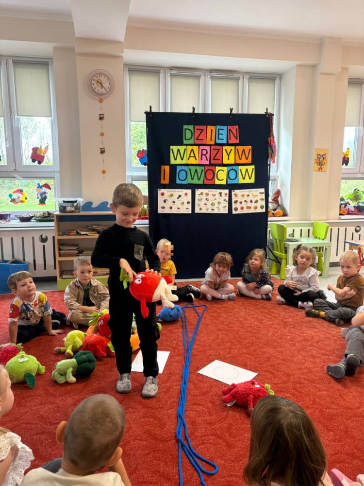 Dzieci uczestniczą w zabawach z okazji Światowego Dnia Warzyw i Owoców.