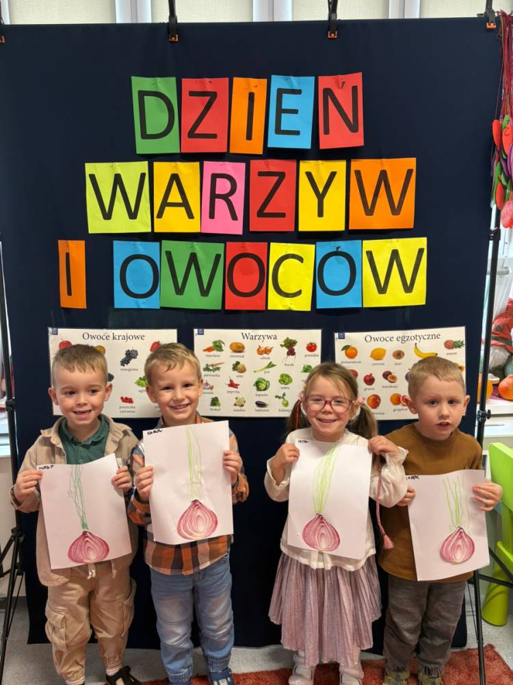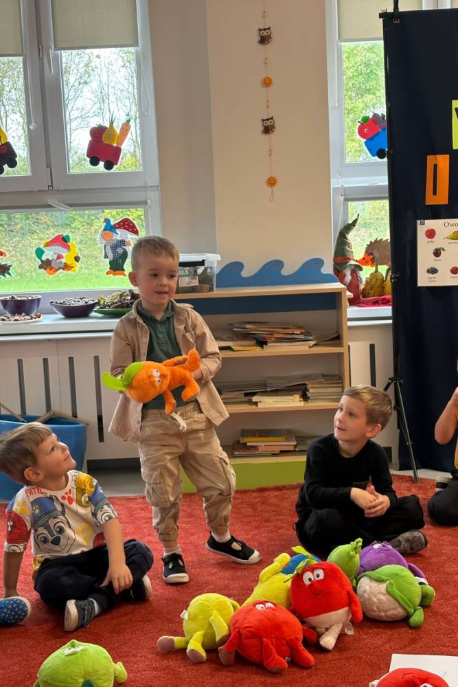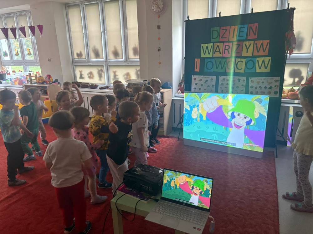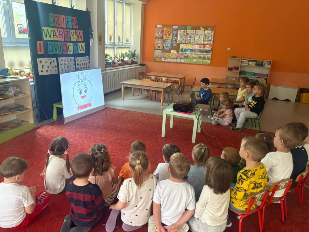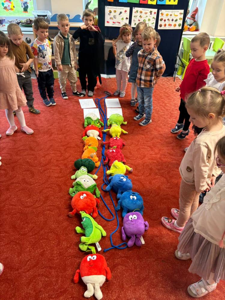 Dzieci uczestniczą w zabawach z okazji Światowego Dnia Warzyw i Owoców.