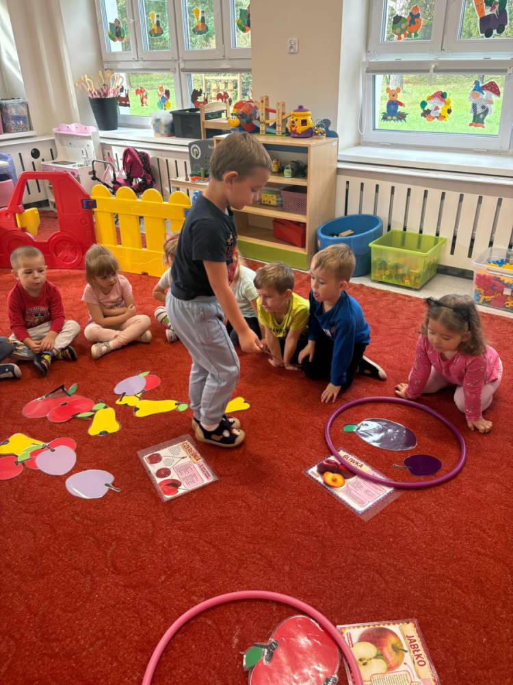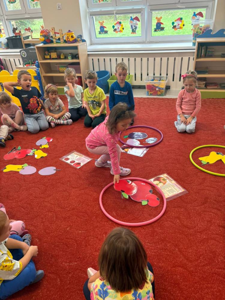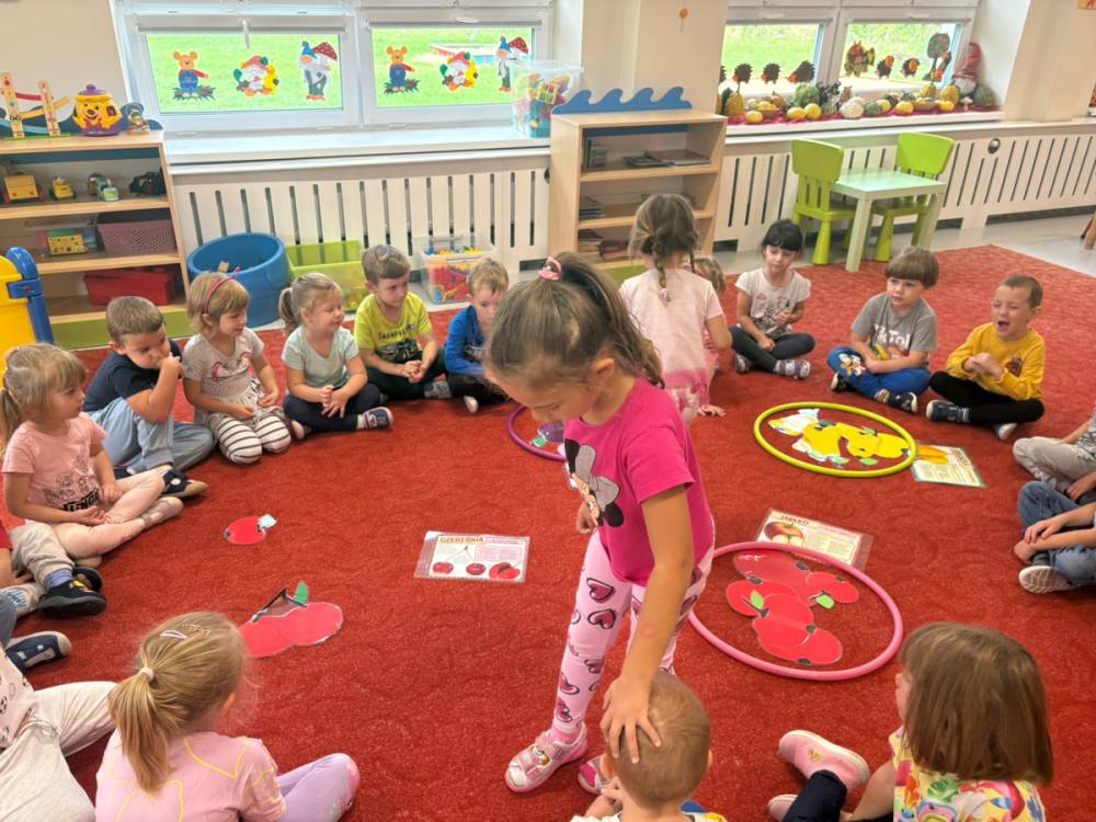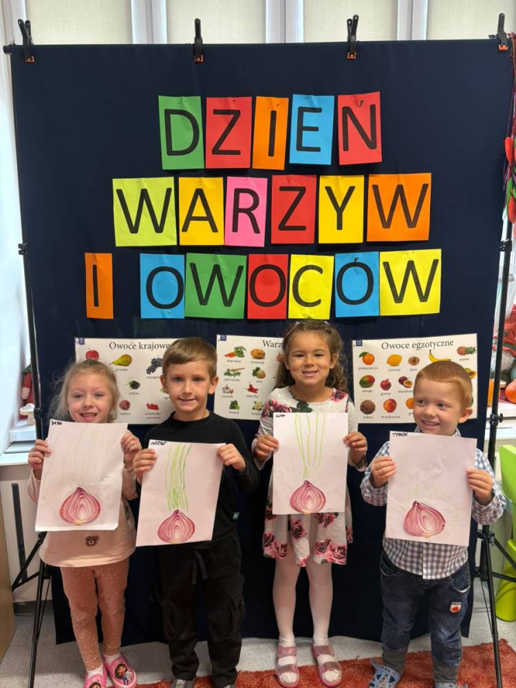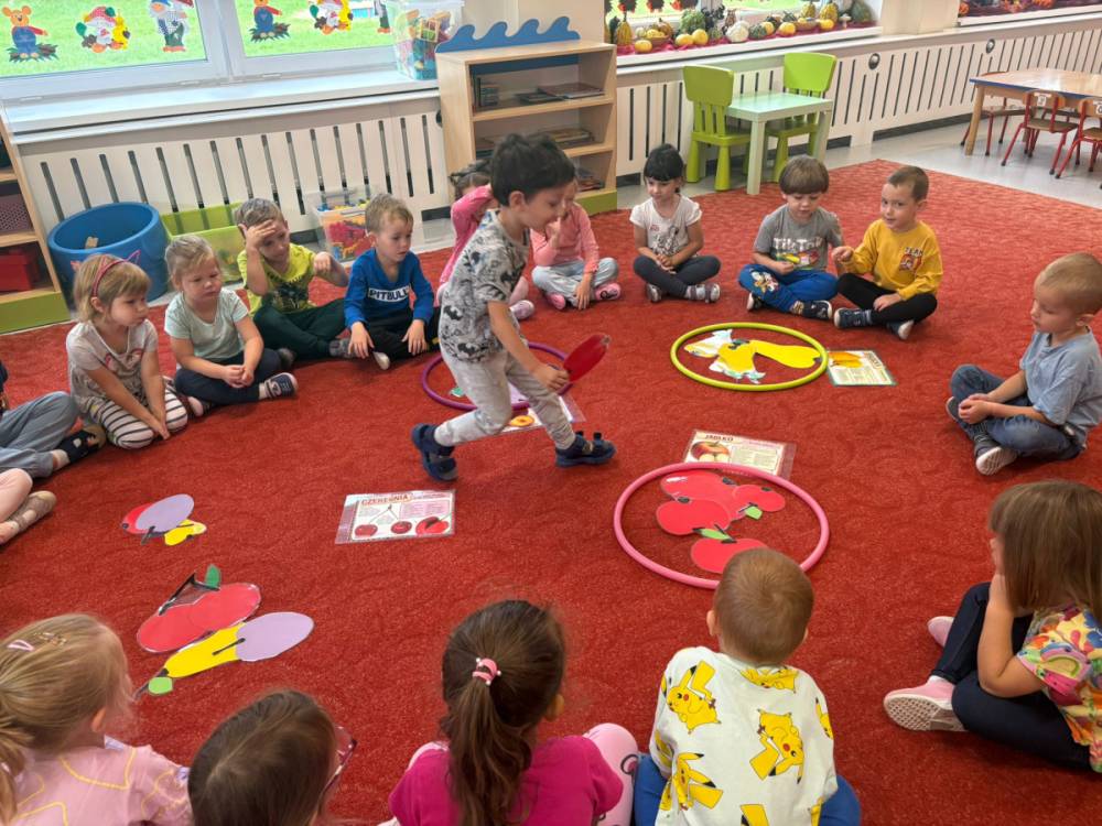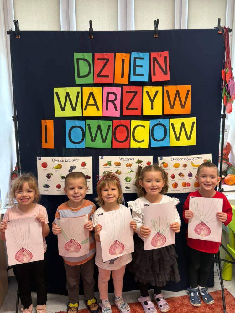 Dzieci uczestniczą w zabawach z okazji Światowego Dnia Warzyw i Owoców.