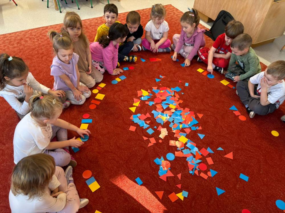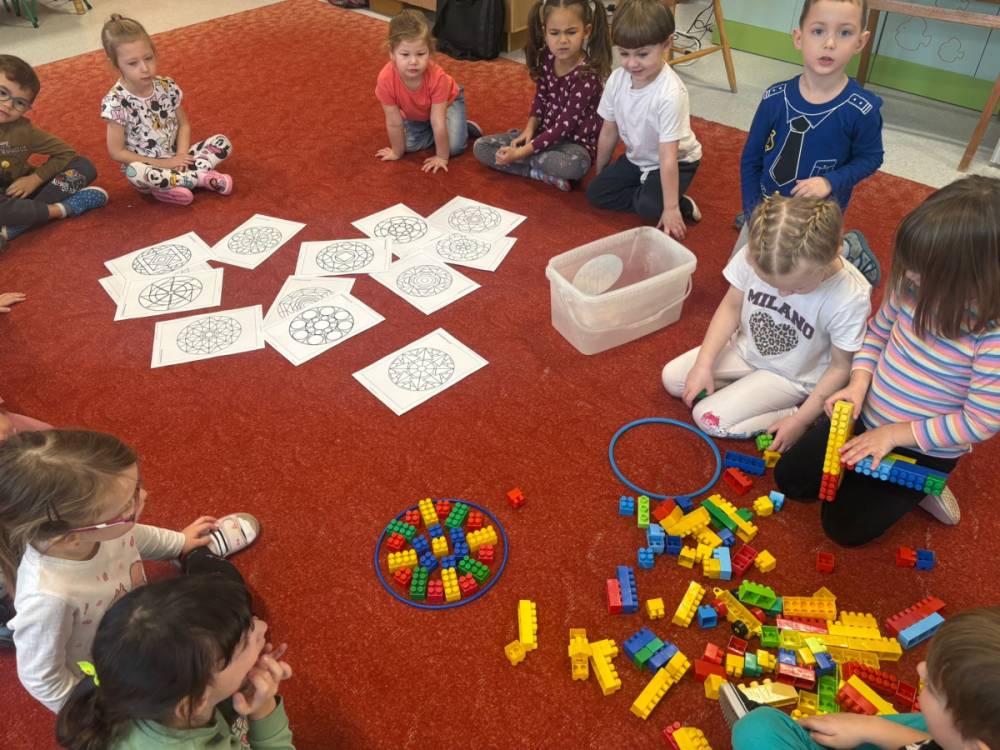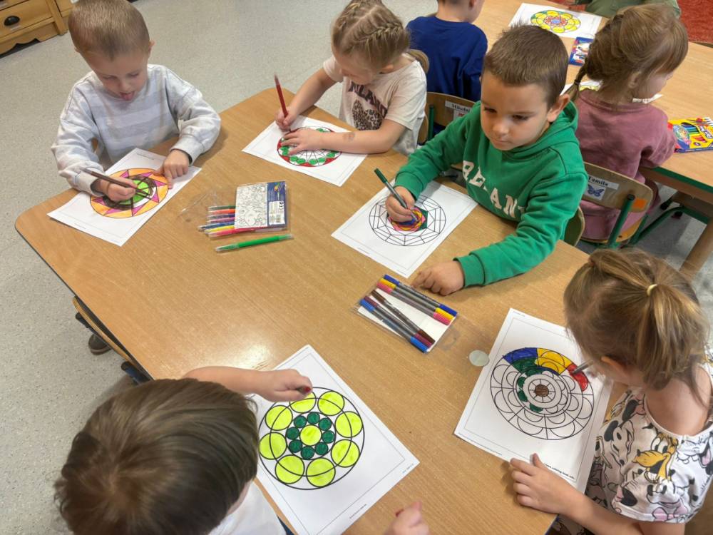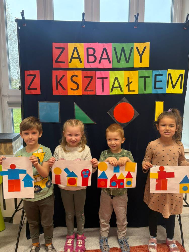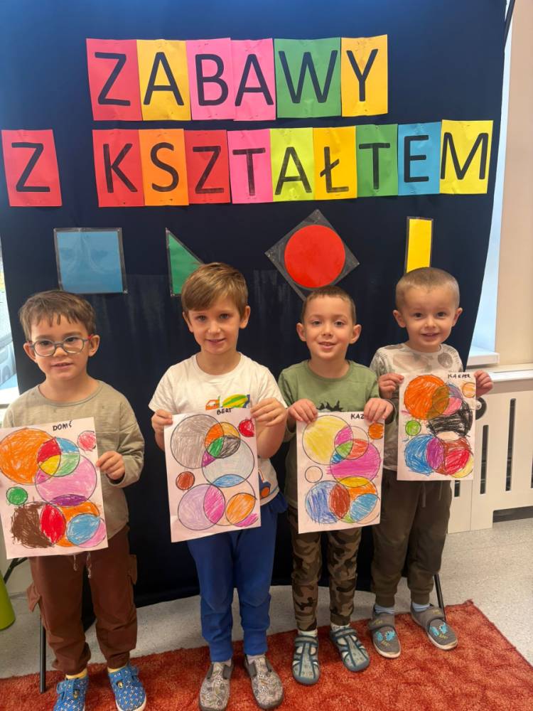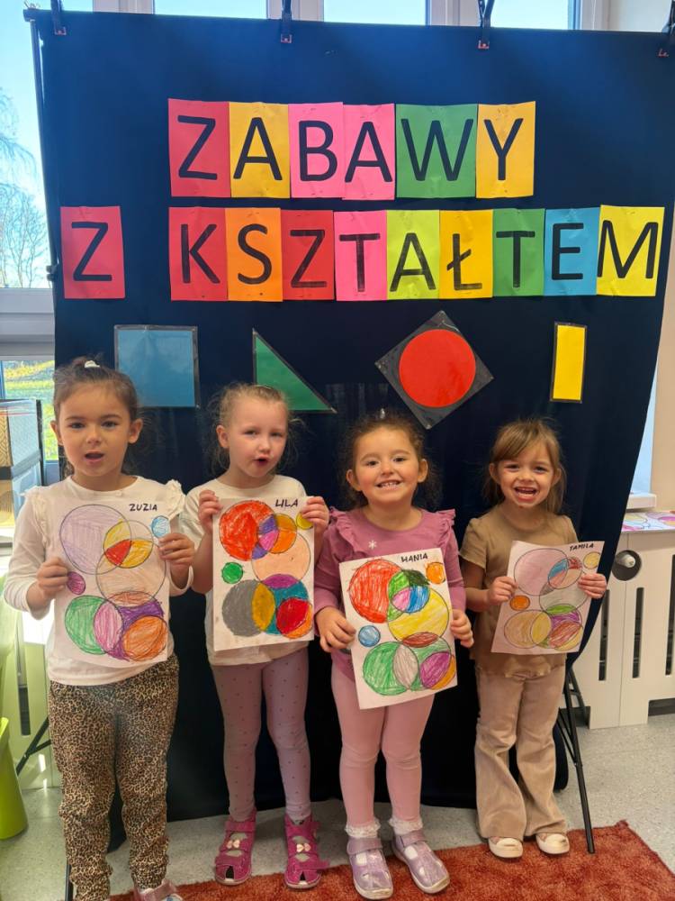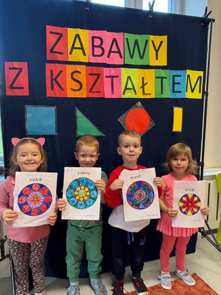 „Zabawy z kształtem” to drugie zadanie wykonane w grupie „Słoneczka” w ramach Ogólnopolskiego Projektu Edukacyjnego „Kreatywna Matematyka”. Dzieci realizując cele zadania rozwijały wyobraźnię geometryczną, doskonaliły umiejętność logicznego myślenia, kształtowały kreatywność i twórcze myślenie. Przedszkolaki, w sposób adekwatny do wieku, zostały zaznajomione z podstawowymi pojęciami geometrycznymi, poznały symbolikę mandali, tworzyły prace plastyczne