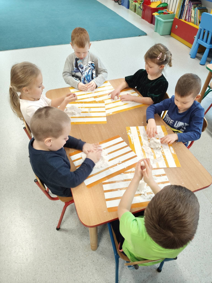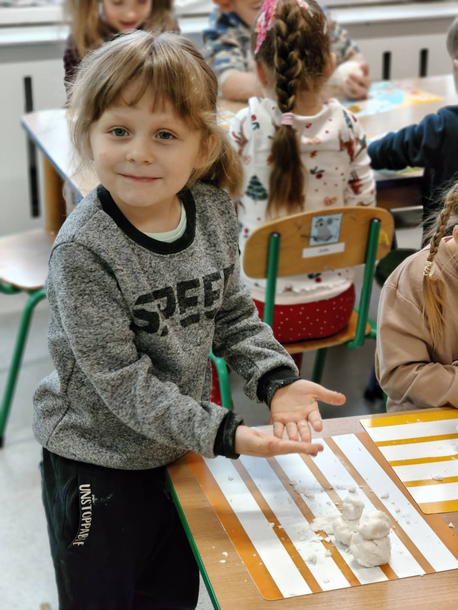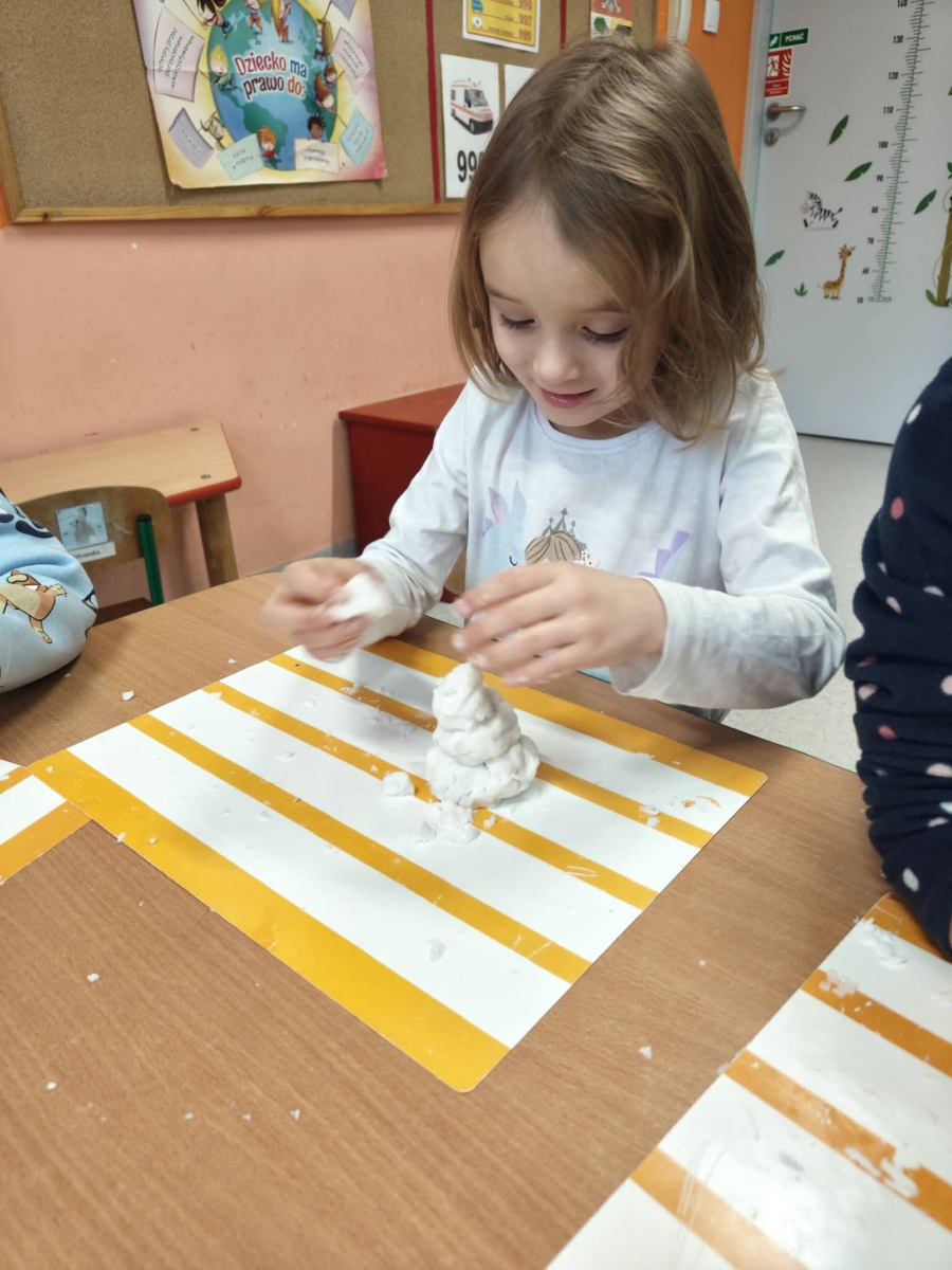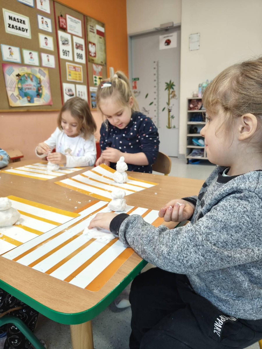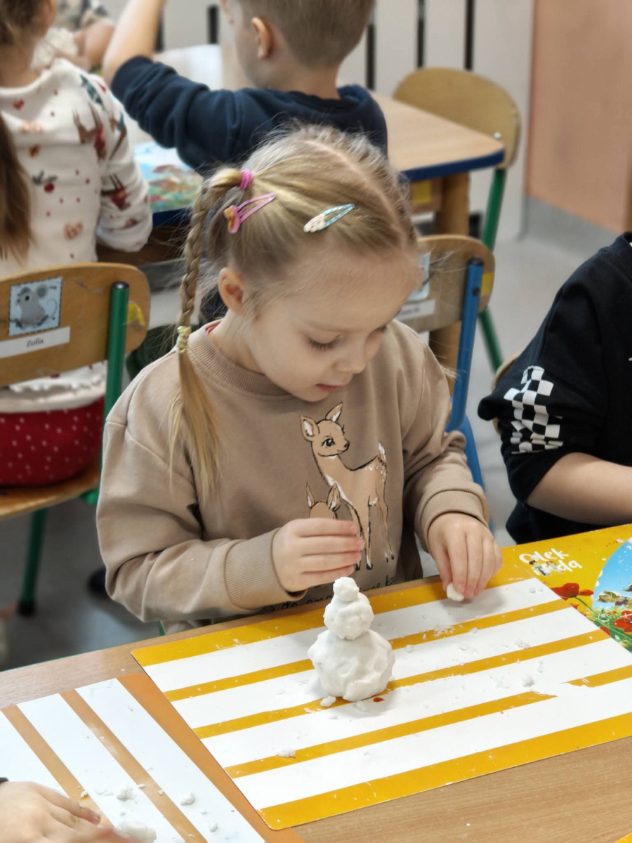 Zadanie rozpoczęliśmy od zapoznania się z dziełami takich artystów jak: Teodor Axentowicz, Stanisław Wyspiański, Ferdynand Ruszczyc, Jan Stanisławski, Edward Kokoszko, Claude Monet, Caspar David Friedrich oraz Tadeusz Makowski. Każdy z Panów ukazał piękno zimy na swój wyjątkowy sposób. Po tym nadszedł czas na wielką frajdę czyli lepienie, ugniatanie, rolowanie i ściskanie sztucznego śniegu, co jest świetną zabawą ale również doskonałym ćwiczeniem motoryki małej.