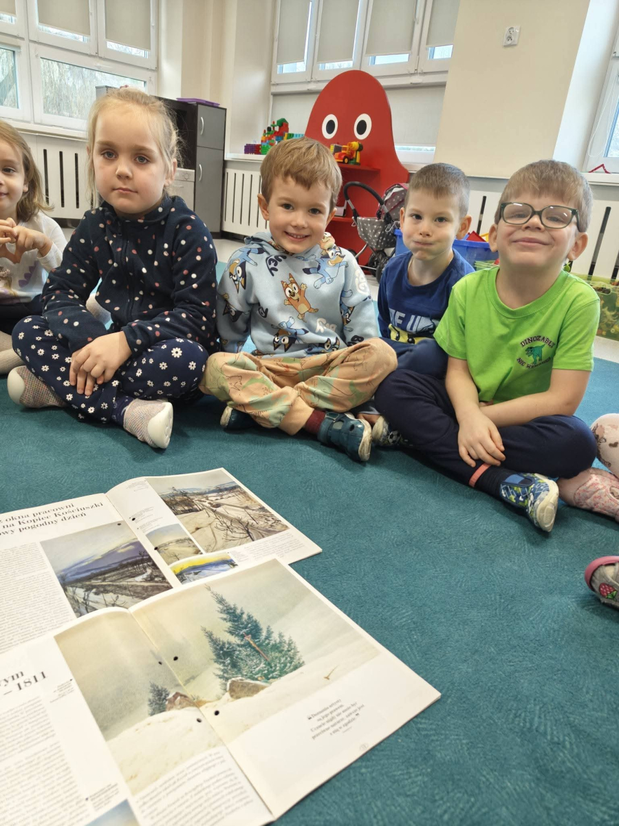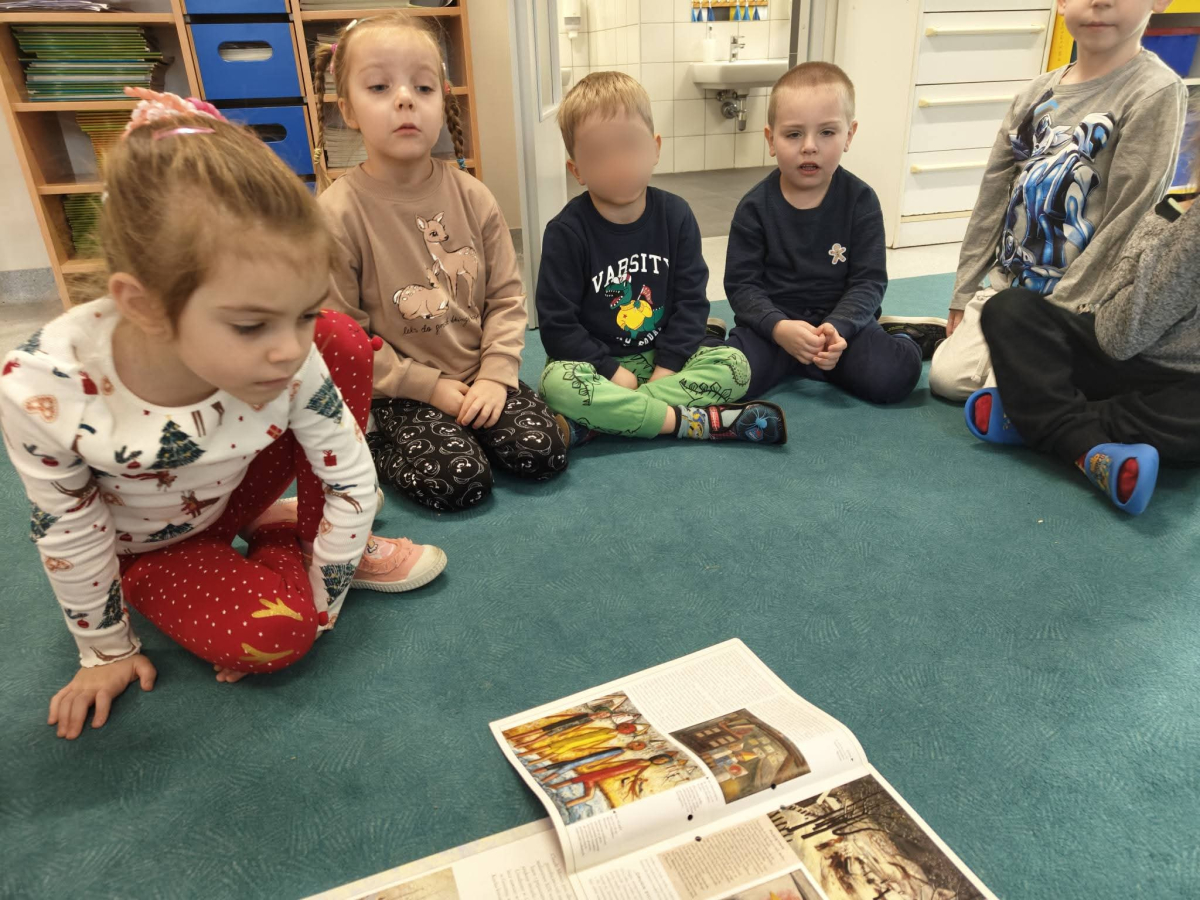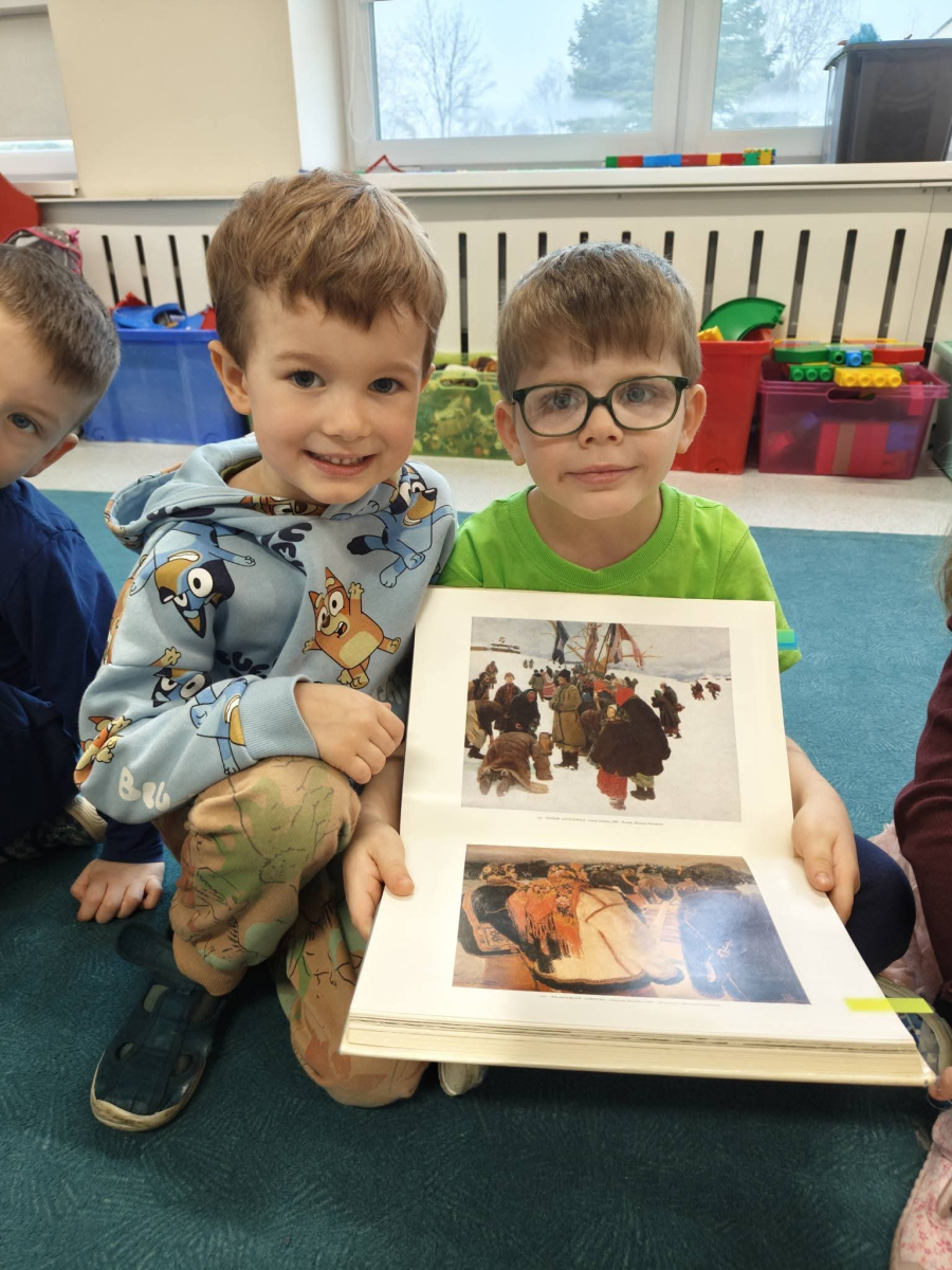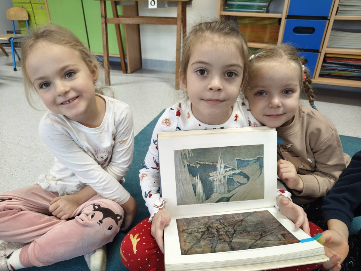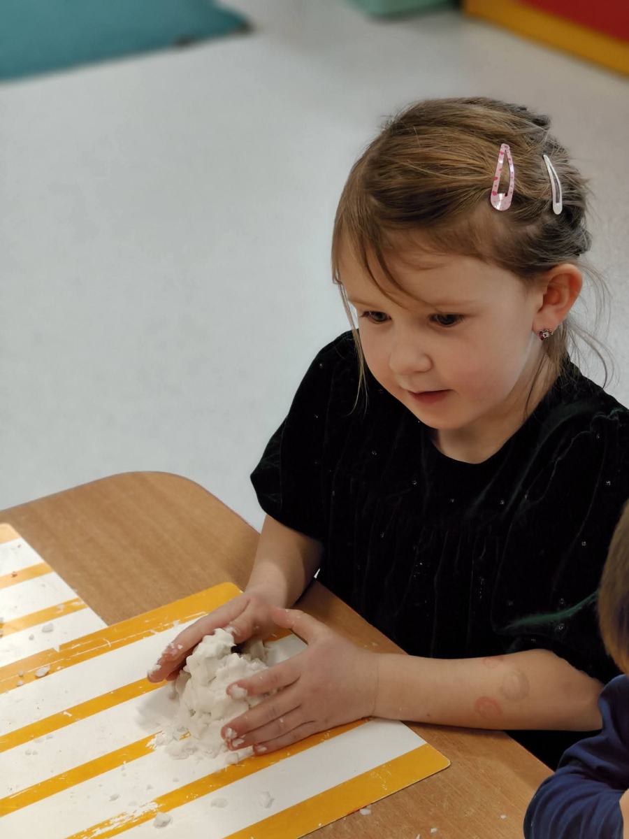 Zadanie rozpoczęliśmy od zapoznania się z dziełami takich artystów jak: Teodor Axentowicz, Stanisław Wyspiański, Ferdynand Ruszczyc, Jan Stanisławski, Edward Kokoszko, Claude Monet, Caspar David Friedrich oraz Tadeusz Makowski. Każdy z Panów ukazał piękno zimy na swój wyjątkowy sposób. Po tym nadszedł czas na wielką frajdę czyli lepienie, ugniatanie, rolowanie i ściskanie sztucznego śniegu, co jest świetną zabawą ale również doskonałym ćwiczeniem motoryki małej.