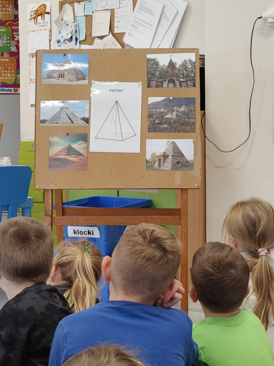Zadanie rozpoczęto od zapoznania się z tym jak wygląda piramida , jakie figury geometrycznie w niej dominują. Dzieci dowiedziały się, że nawet w Polsce można znaleźć przykłady pięknie zachowanych budowli w tym typie, m.in. piramidy kujawskie, piramida w Rapie, Wągrowcu czy w Zagórzanach.