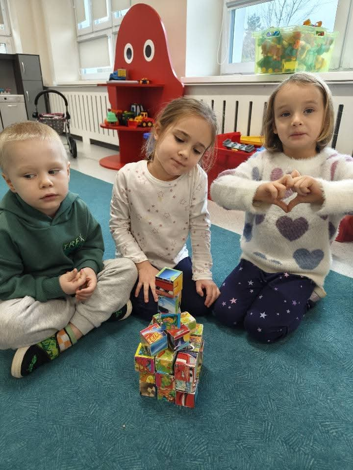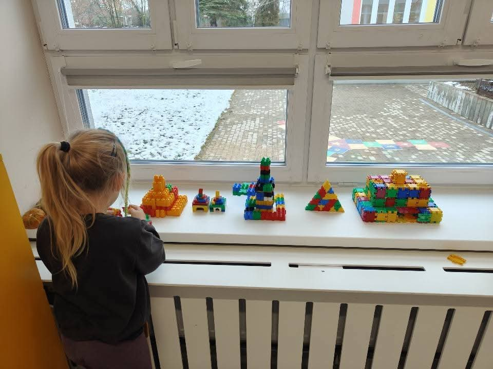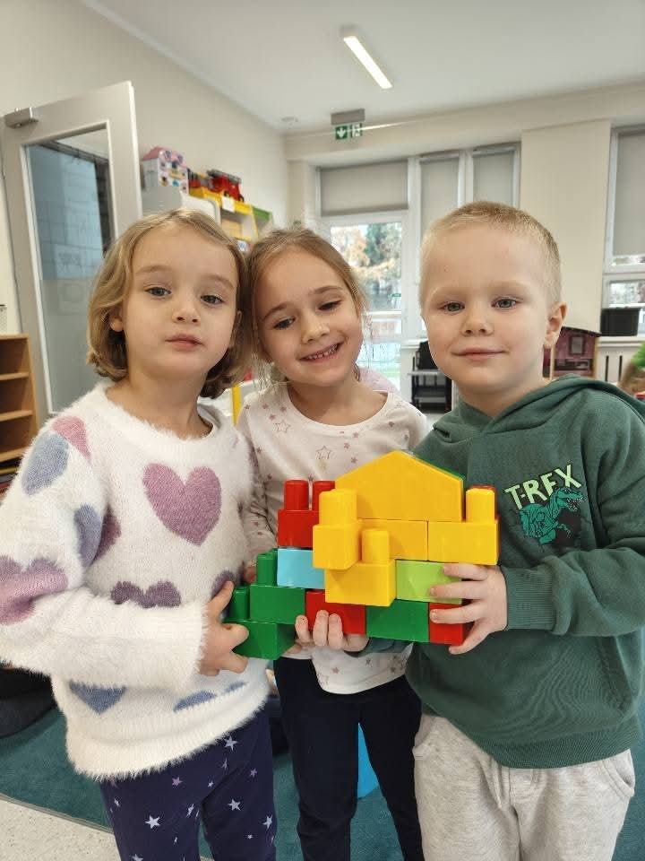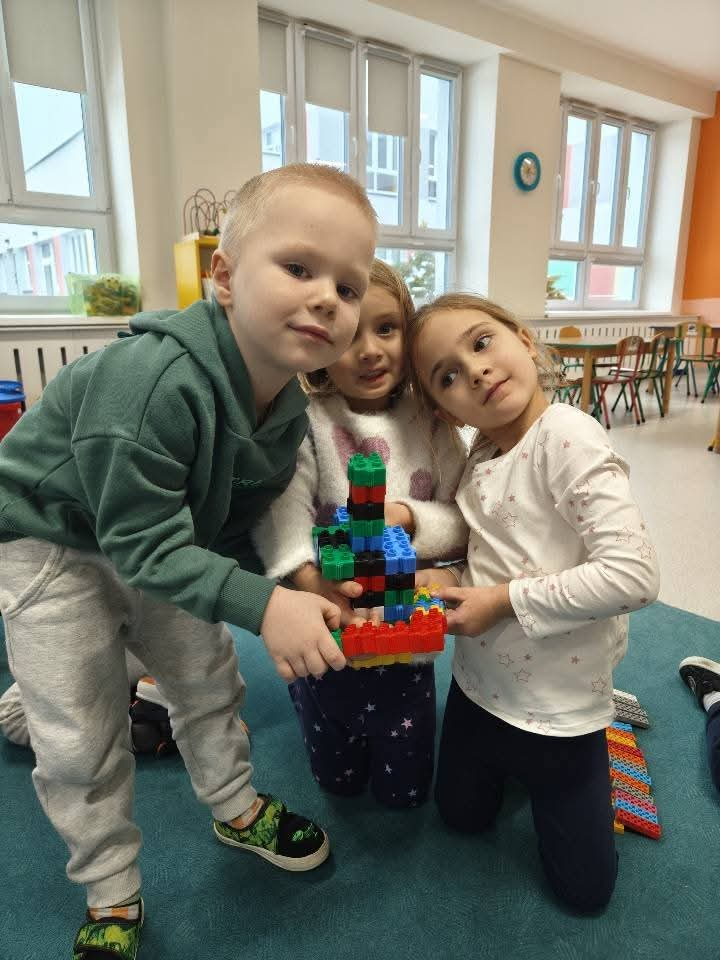 Po teorii przyszła kolej na działanie. Dzieci zainspirowane fotografiami same zbudowały konstrukcje z różnych klocków, starając się odwzorować poznany wcześniej kształt.