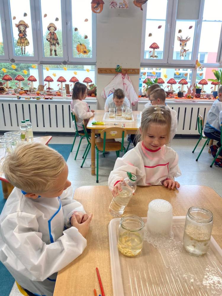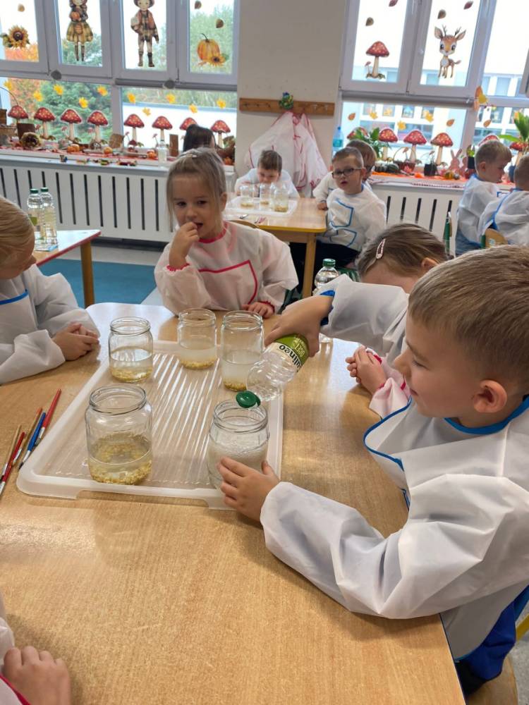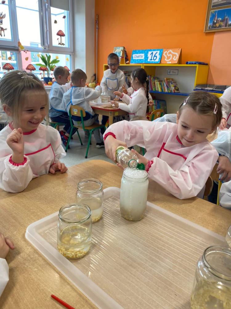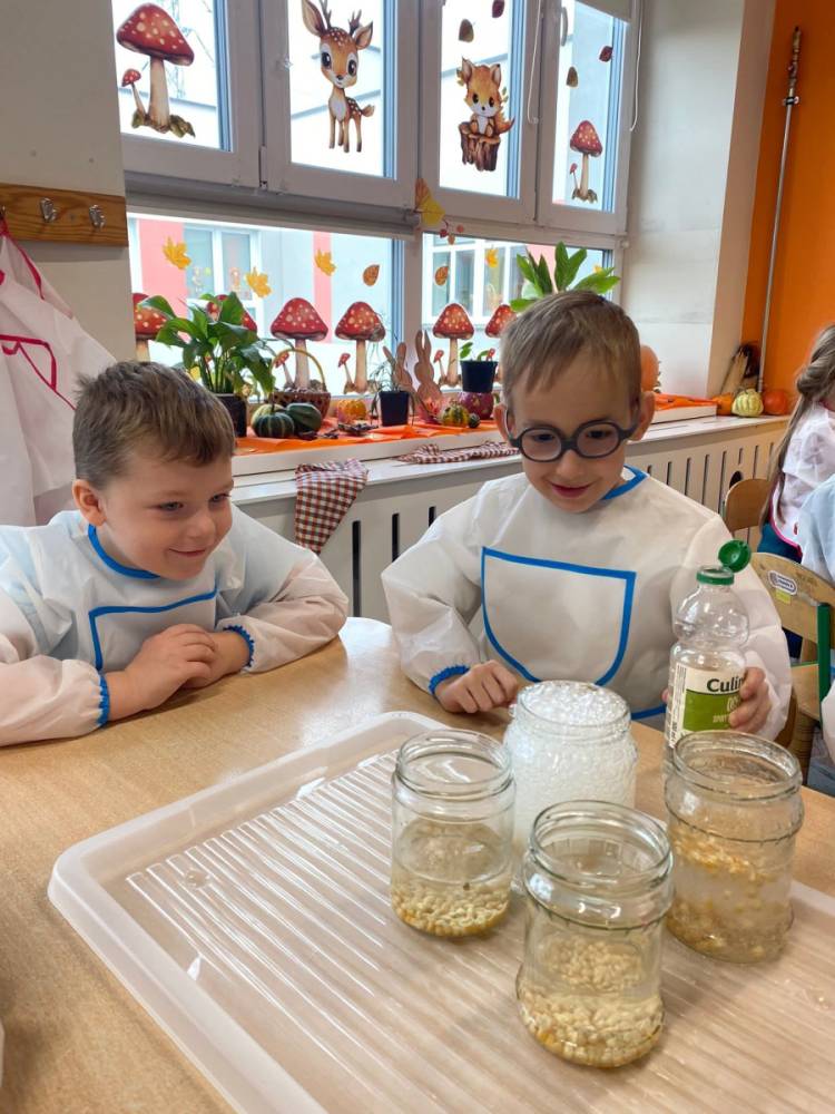 Dzieci z zainteresowaniem obserwowały, jak ziarenka kukurydzy szaleją pod wpływem różnych substancji– było trochę nauki, dużo śmiechu i jeszcze więcej ciekawości.