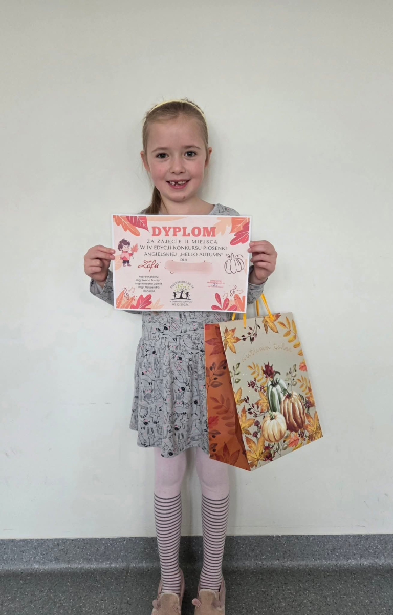 Jest nam niezmiernie miło poinformować o sukcesie Zosi Sz. z grupy "Żabki" , która brała udział w IV Konkursie Piosenki Angielskiej "Hello Autumn".