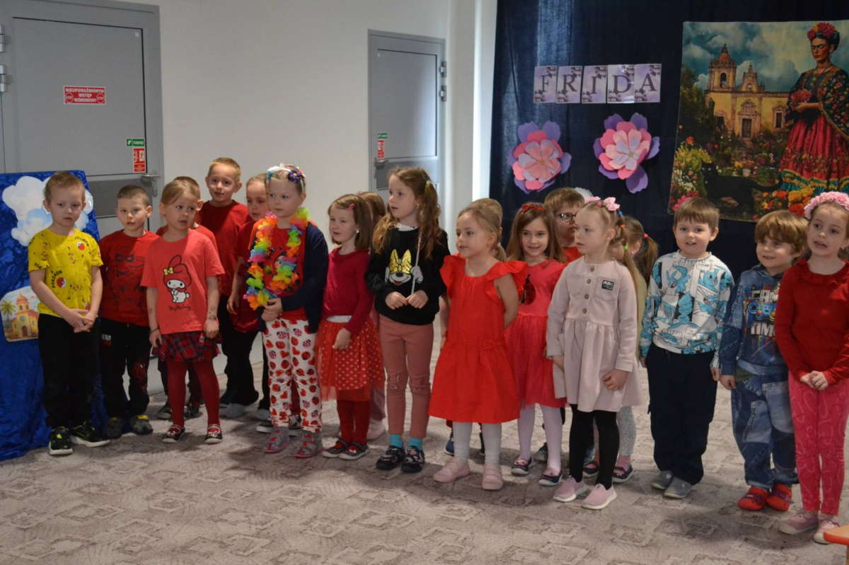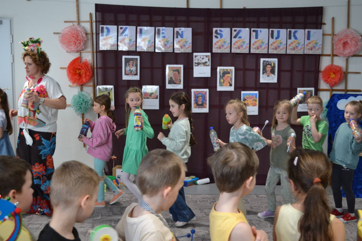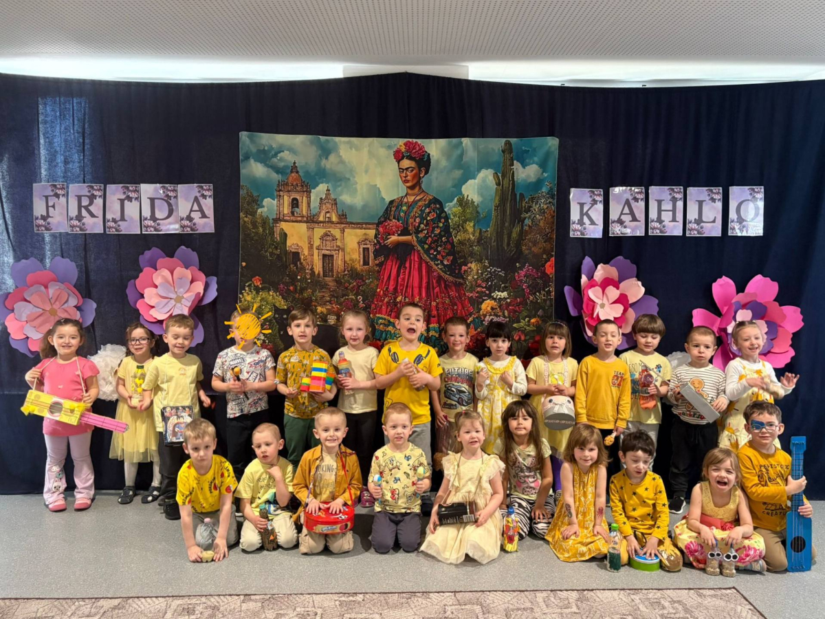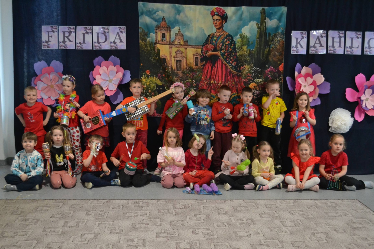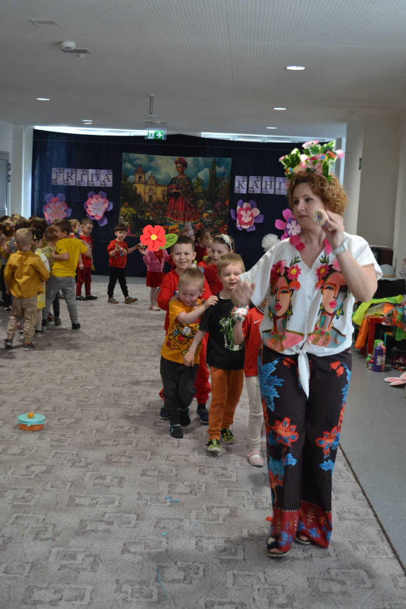 Nasze przedszkole wypełniło się kolorem, muzyką i niezwykłą energią twórczą. Inspiracją do wspólnych działań była postać Fridy Kahlo - artystki, której życie i twórczość stały się punktem wyjścia do odkrywania świata sztuki. Dzieci poznały jej historię poprzez opowieść i teatrzyk, który w przystępny sposób przybliżył im losy malarki. Następnie same mogły wejść w rolę twórców - uczestnicząc w aktywnościach plastycznych, muzycznych i tanecznych, rozwijając wyobraźnię oraz wrażliwość artystyczną. Szczególnym momentem było wspólne muzykowanie - przedszkolaki zagrały na własnoręcznie wykonanych instrumentach do rytmów tradycyjnej pieśni „La Cucaracha”. Nie zabrakło również nauki „Meksykańskiego Tańca Kapelusza” - La Raspa, który dostarczył dzieciom wiele radości i ruchu. Finałem dnia była prawdziwa fiesta. Wspólny „wężyk” do skocznej muzyki z ojczyzny Fridy stał się pięknym zwieńczeniem artystycznej podróży. Dzień Sztuki był nie tylko okazją do zabawy, ale także do odkrywania, że sztuka może być bliska każdemu - niezależnie od wieku.