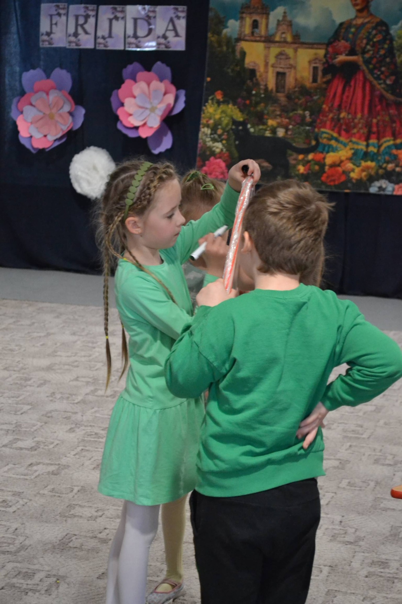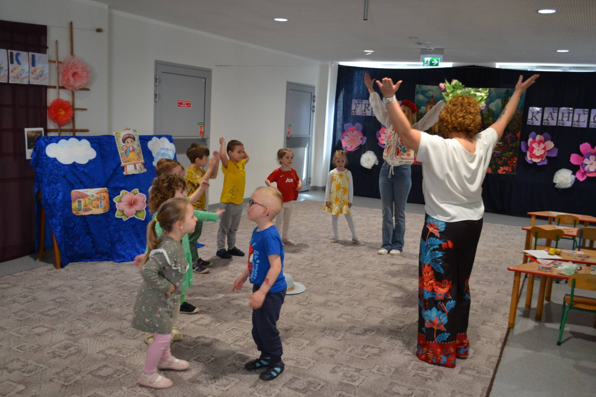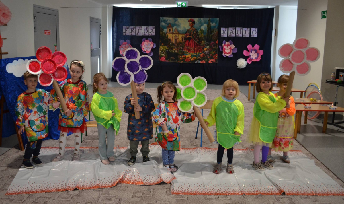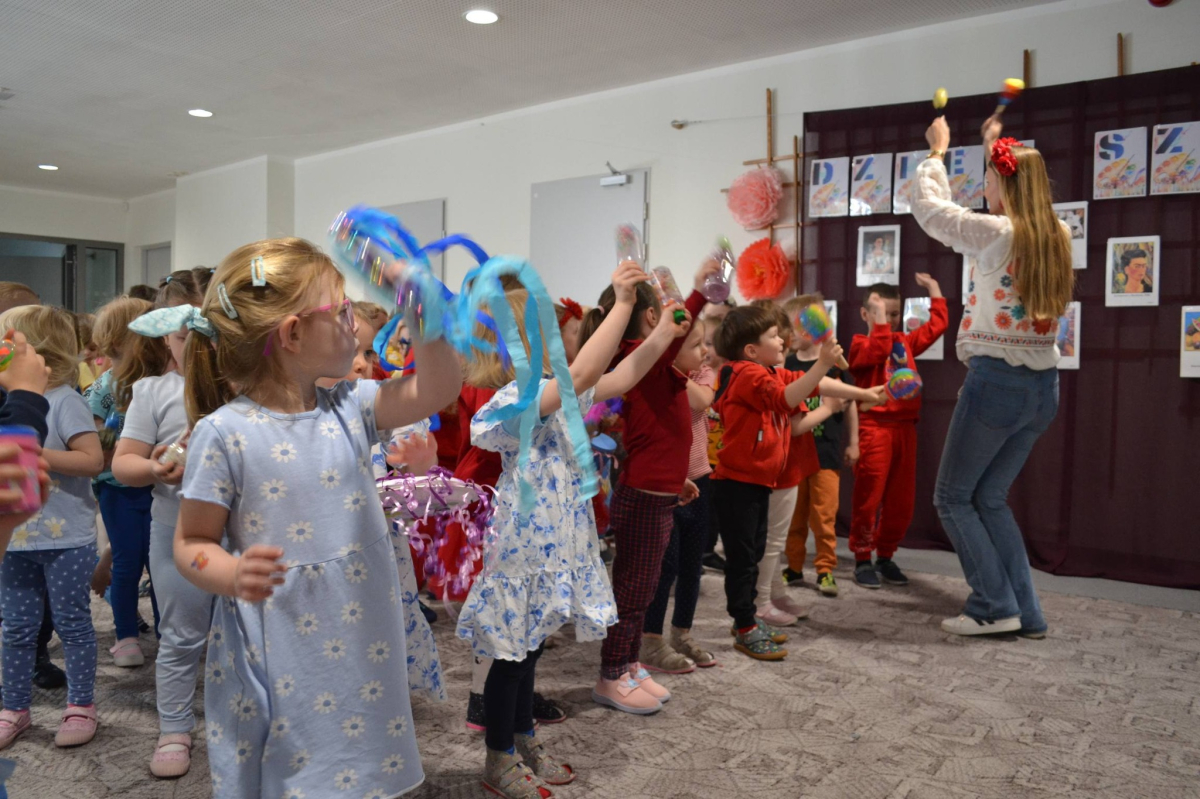 Nasze przedszkole wypełniło się kolorem, muzyką i niezwykłą energią twórczą. Inspiracją do wspólnych działań była postać Fridy Kahlo - artystki, której życie i twórczość stały się punktem wyjścia do odkrywania świata sztuki. Dzieci poznały jej historię poprzez opowieść i teatrzyk, który w przystępny sposób przybliżył im losy malarki. Następnie same mogły wejść w rolę twórców - uczestnicząc w aktywnościach plastycznych, muzycznych i tanecznych, rozwijając wyobraźnię oraz wrażliwość artystyczną. Szczególnym momentem było wspólne muzykowanie - przedszkolaki zagrały na własnoręcznie wykonanych instrumentach do rytmów tradycyjnej pieśni „La Cucaracha”. Nie zabrakło również nauki „Meksykańskiego Tańca Kapelusza” - La Raspa, który dostarczył dzieciom wiele radości i ruchu. Finałem dnia była prawdziwa fiesta. Wspólny „wężyk” do skocznej muzyki z ojczyzny Fridy stał się pięknym zwieńczeniem artystycznej podróży. Dzień Sztuki był nie tylko okazją do zabawy, ale także do odkrywania, że sztuka może być bliska każdemu - niezależnie od wieku.
