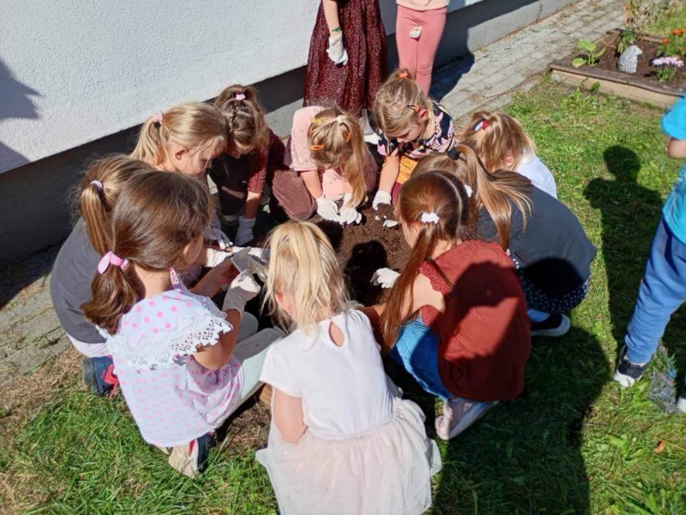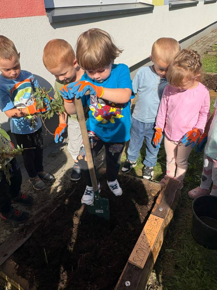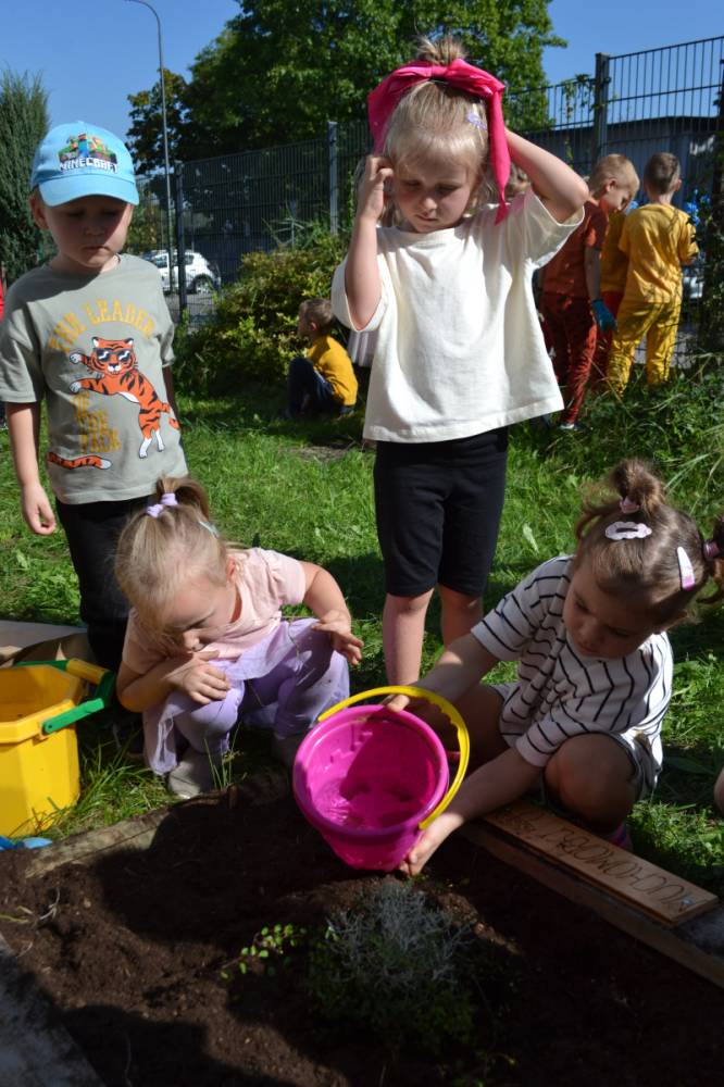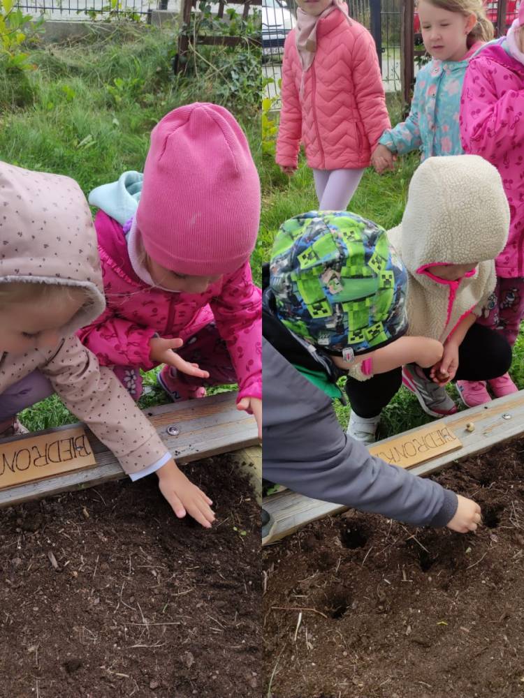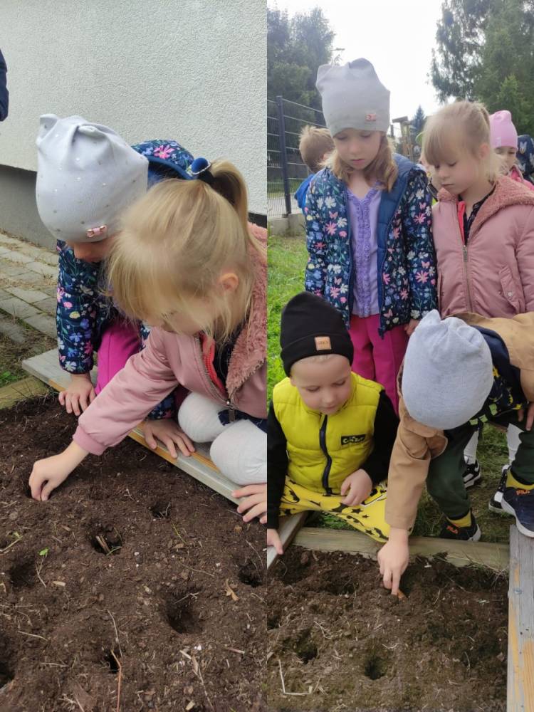 Każda grupa przedszkolaków z ogromnym zaangażowaniem wzięła udział w jesiennym sadzeniu cebulek kwiatowych. Mali ogrodnicy z zapałem kopali, sadzili, podlewali i już teraz troszczą się o swoje rabatki.