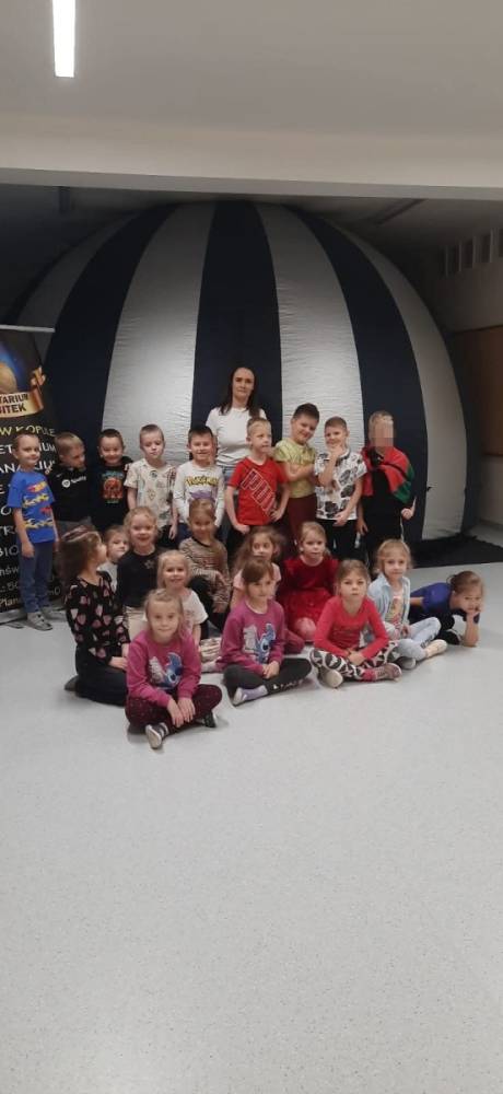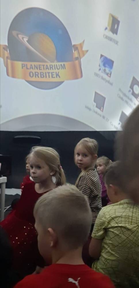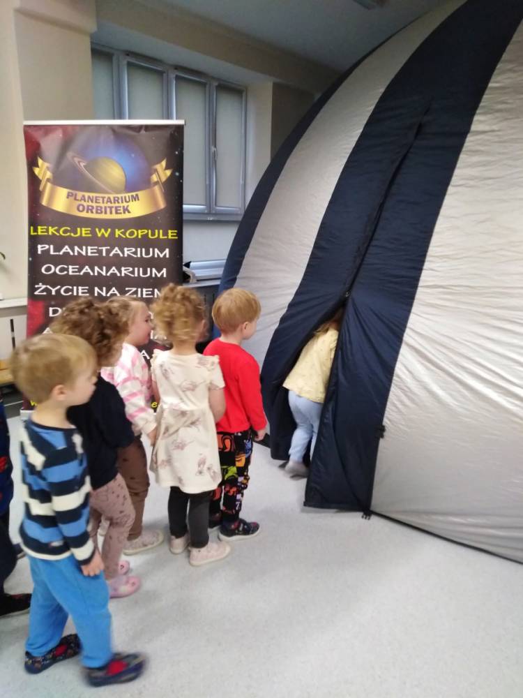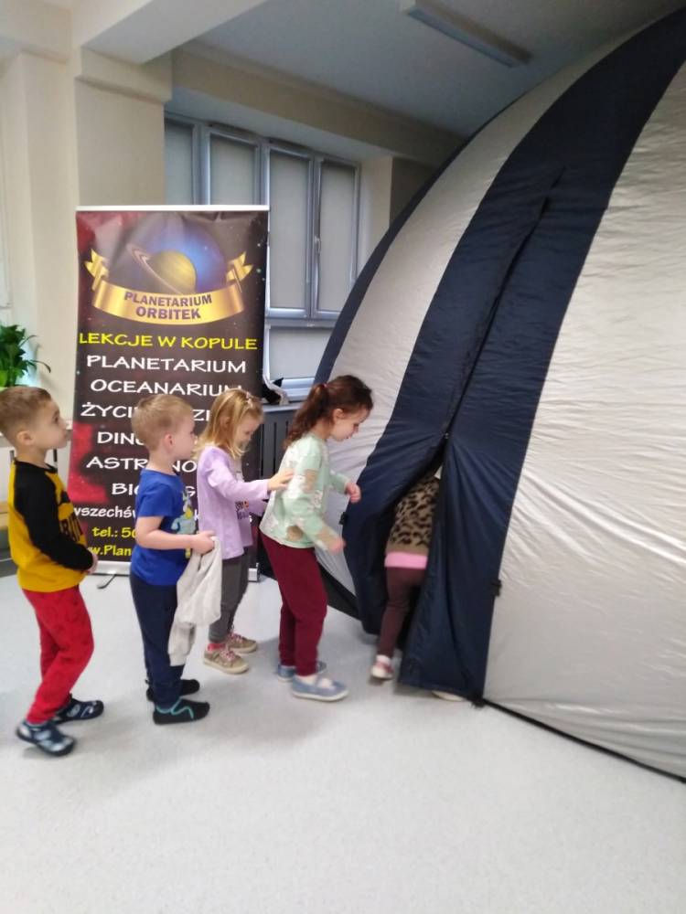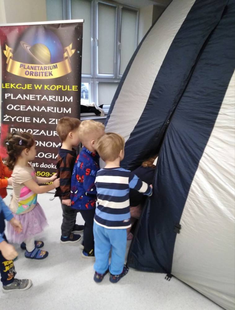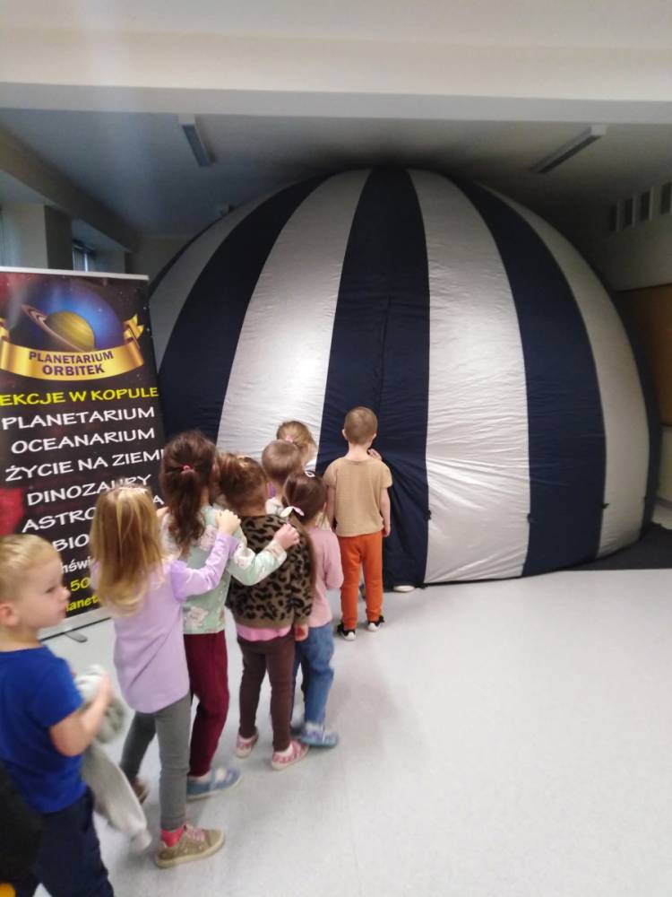 W naszym przedszkolu odbył się pokaz mobilnego planetarium „Orbitek”. Dzieci uczestniczyły w interaktywnym seansie „Ochrona środowiska - Misja Zielone”, podczas którego pomagały kosmicznym przyjaciołom uratować ich las.