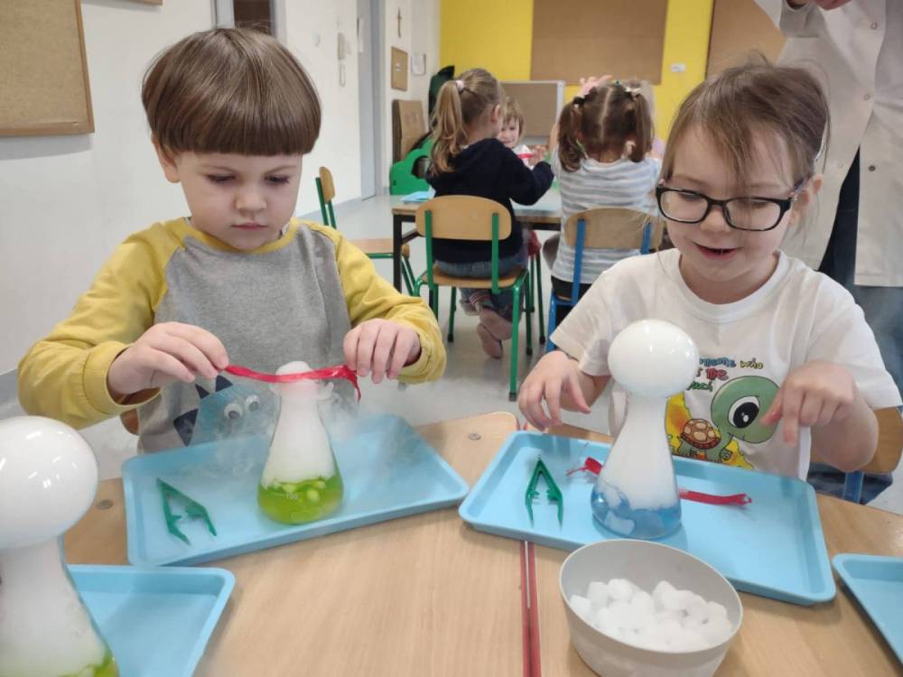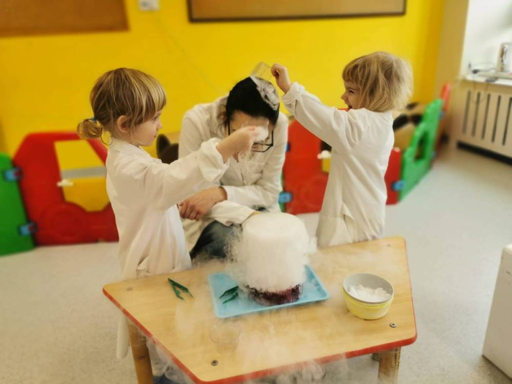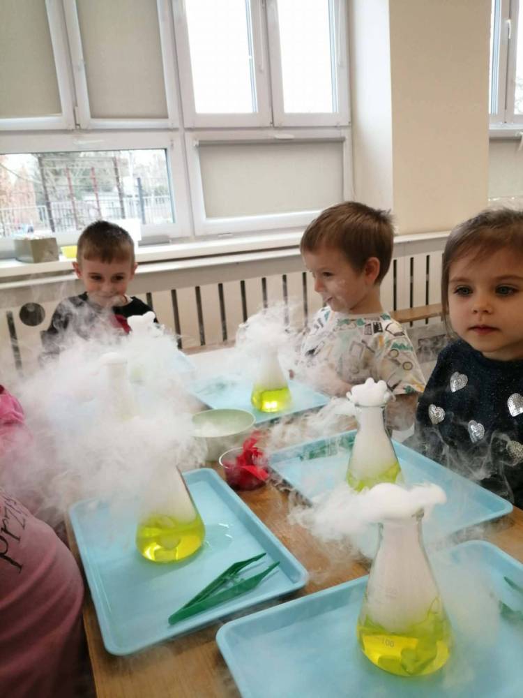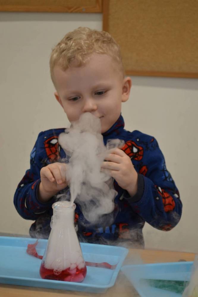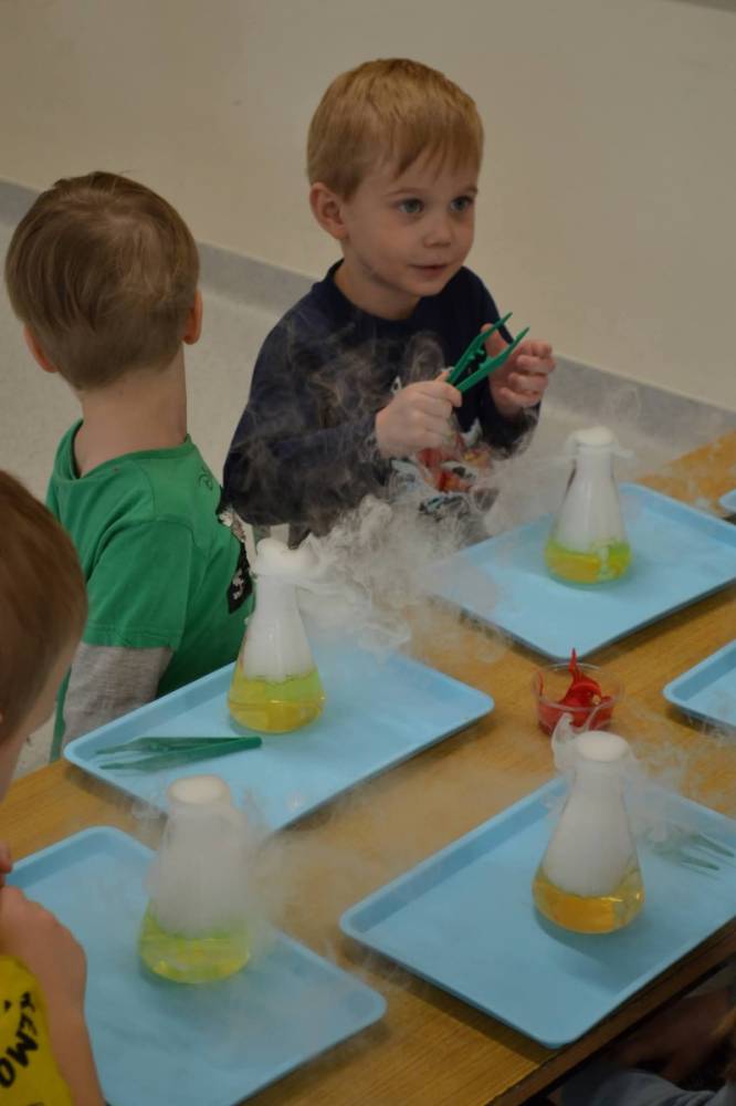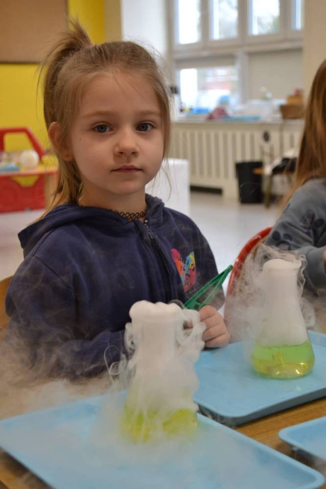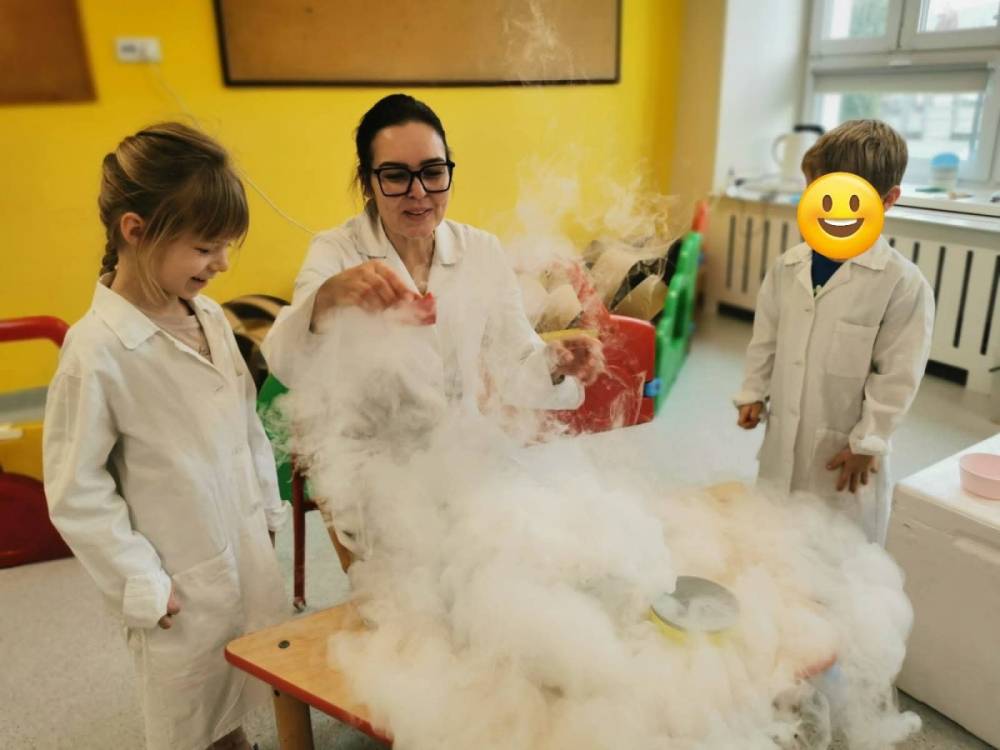 Nasze przedszkolaki przeniosły się do prawdziwej Krainy Nietypowego Lodu. Suchy lód w roli głównej, „dymiące” eksperymenty, znikająca materia i nauka, która wyglądała jak magia… a wszystko to przy akompaniamencie dziecięcych okrzyków zachwytu . Było mnóstwo radości, szeroko otwarte oczy i efekt WOW, który zostaje w pamięci na długo. Bo kiedy dzieci uczą się przez doświadczenie, nauka staje się fascynującą przygodą.